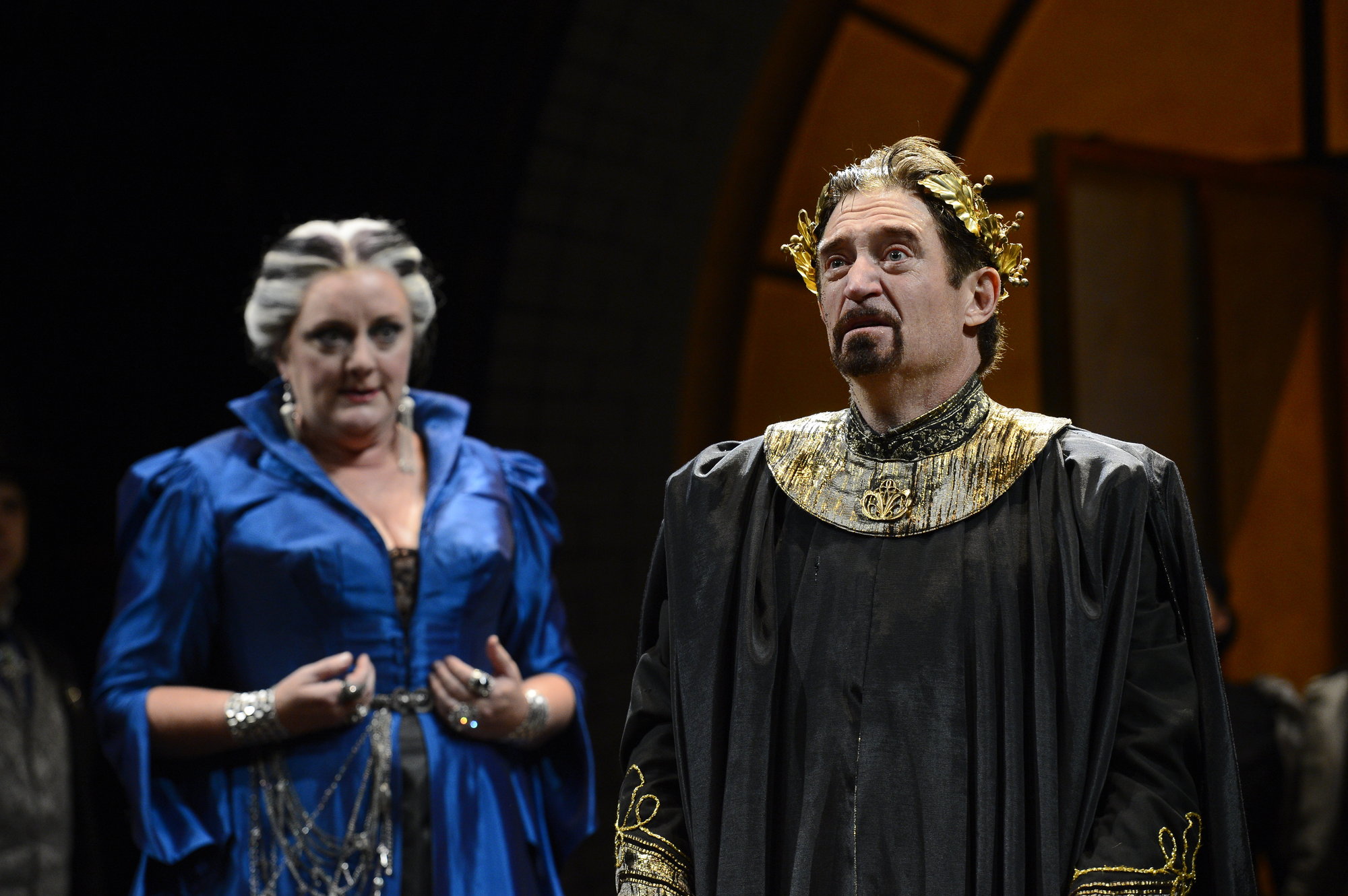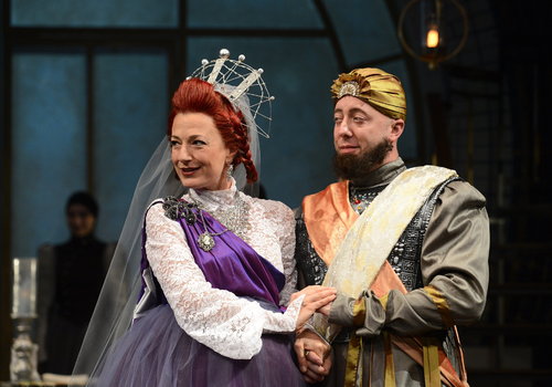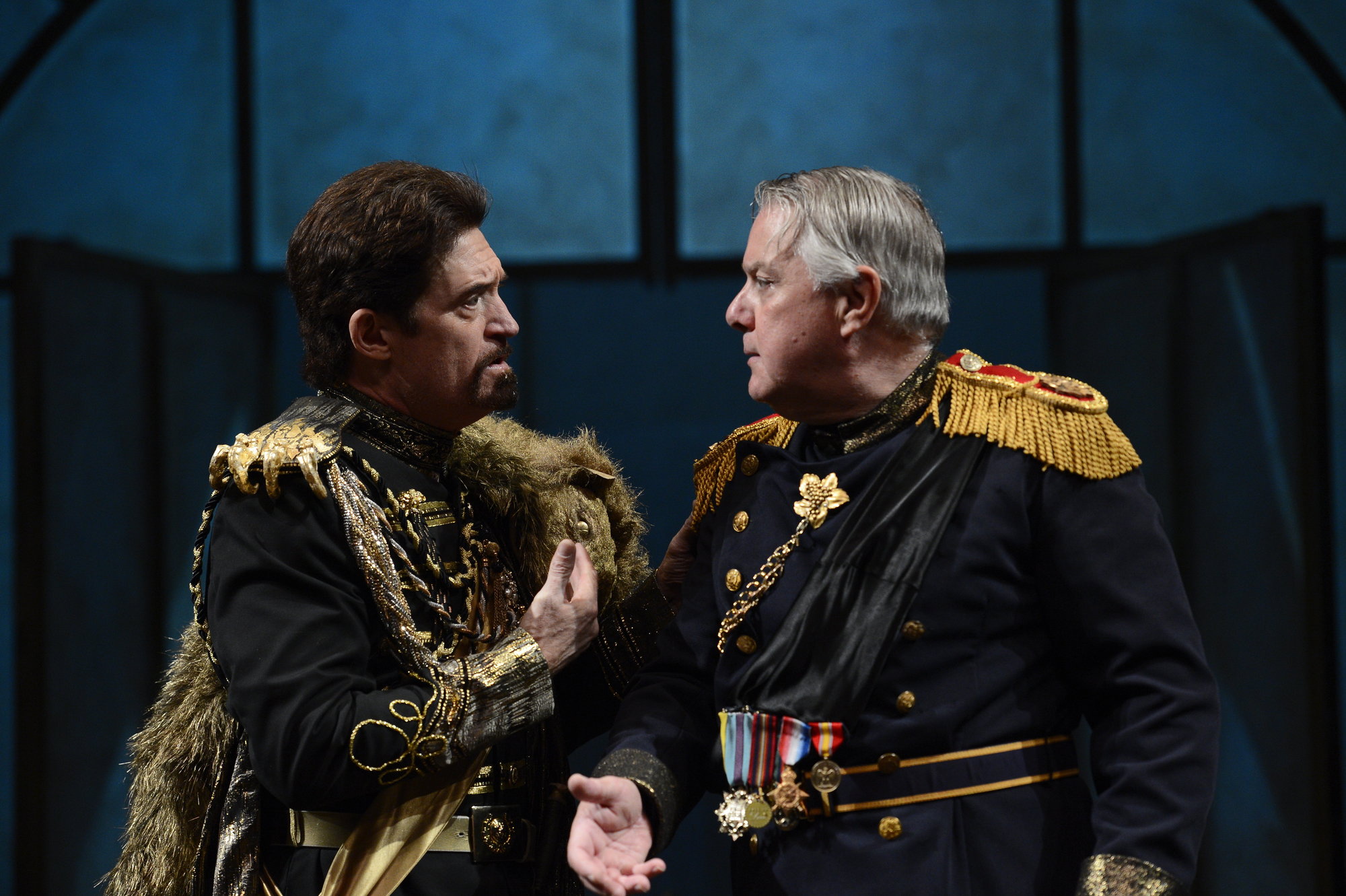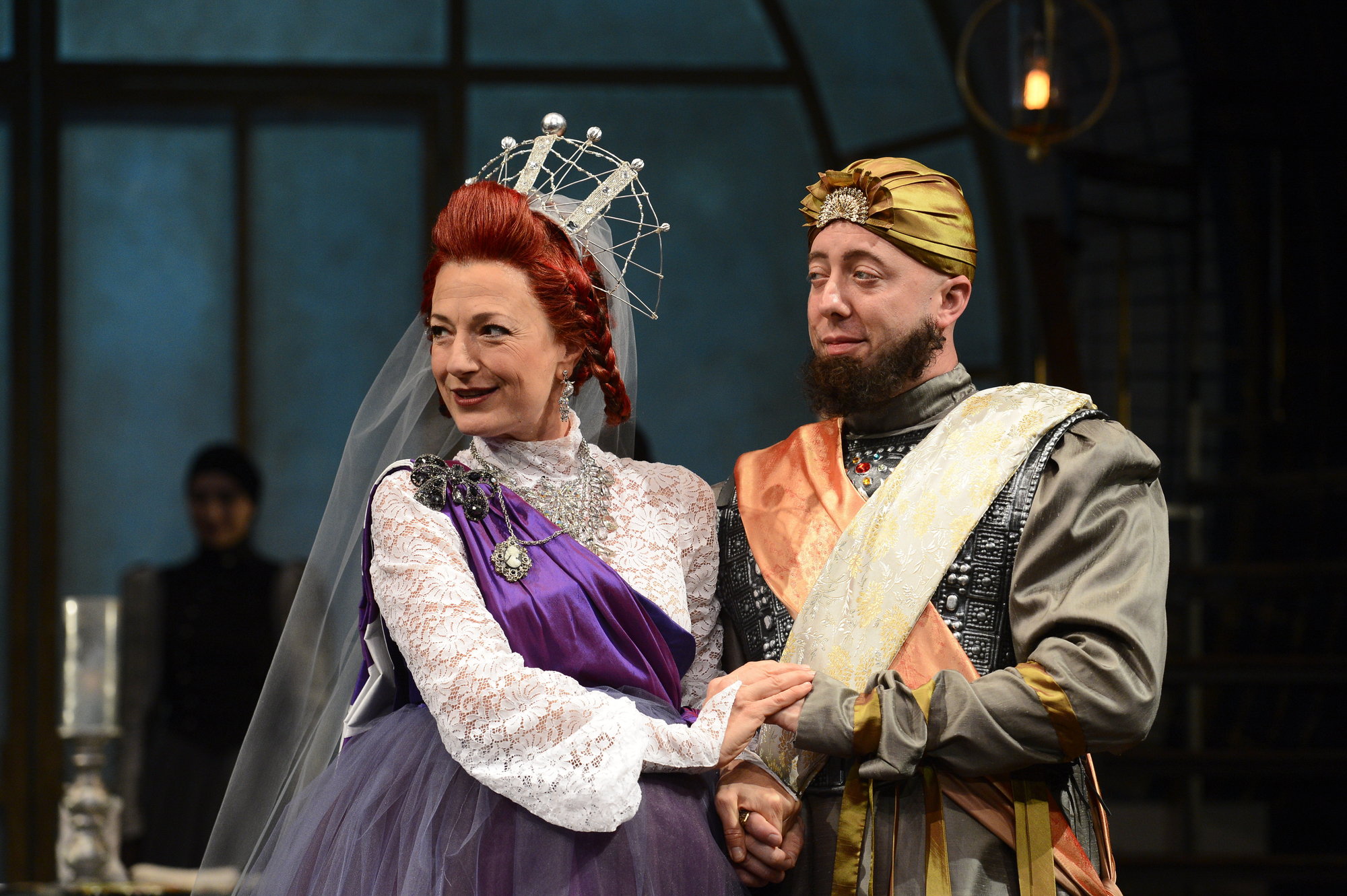 Actors Lori Birmingham (left, as Paulina) and David Anthony Smith (right, as Leontes) star in Great Lakes Theater's season opening production of William Shakespeare's romantic epic "The Winter's Tale" at the Hanna Theatre, PlayhouseSquare. The production will run in rotating repertory with a 60s-inspired, music-infused adaptation of Moliere's classic comedy "The Imaginary Invalid" through November 4, 2012. (Photo by Roger Mastroianni)