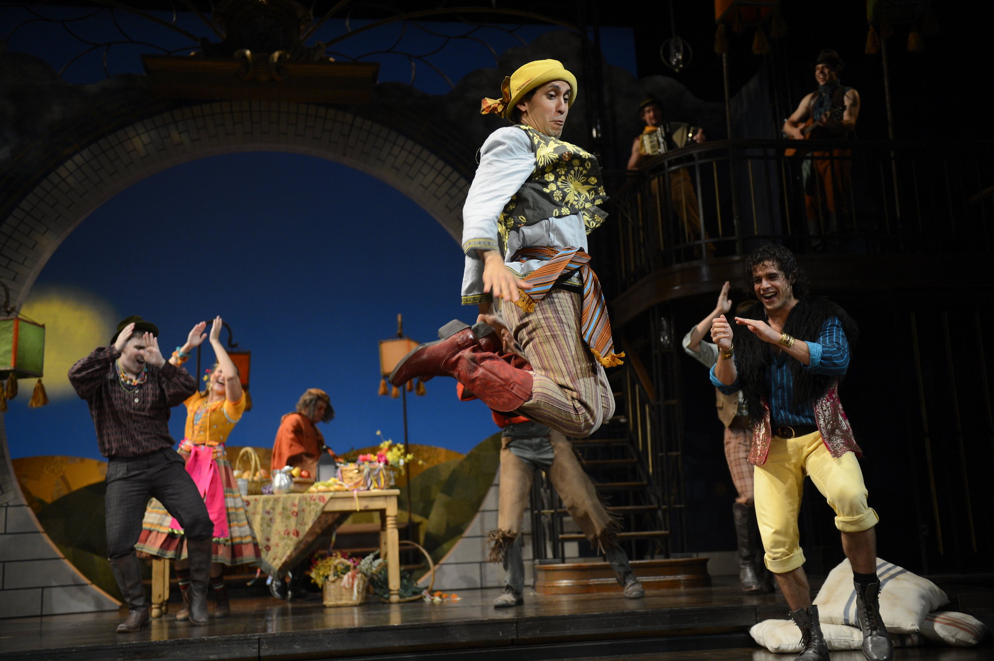 Actor Juan Rivera Lebron (as a Clown) shows off some impressive hops in Great Lakes Theater's season opening production of William Shakespeare's romantic epic "The Winter's Tale" at the Hanna Theatre, PlayhouseSquare. The production will run in rotating repertory with a 60s-inspired, music-infused adaptation of Moliere's classic comedy "The Imaginary Invalid" through November 4, 2012. (Photo by Roger Mastroianni)