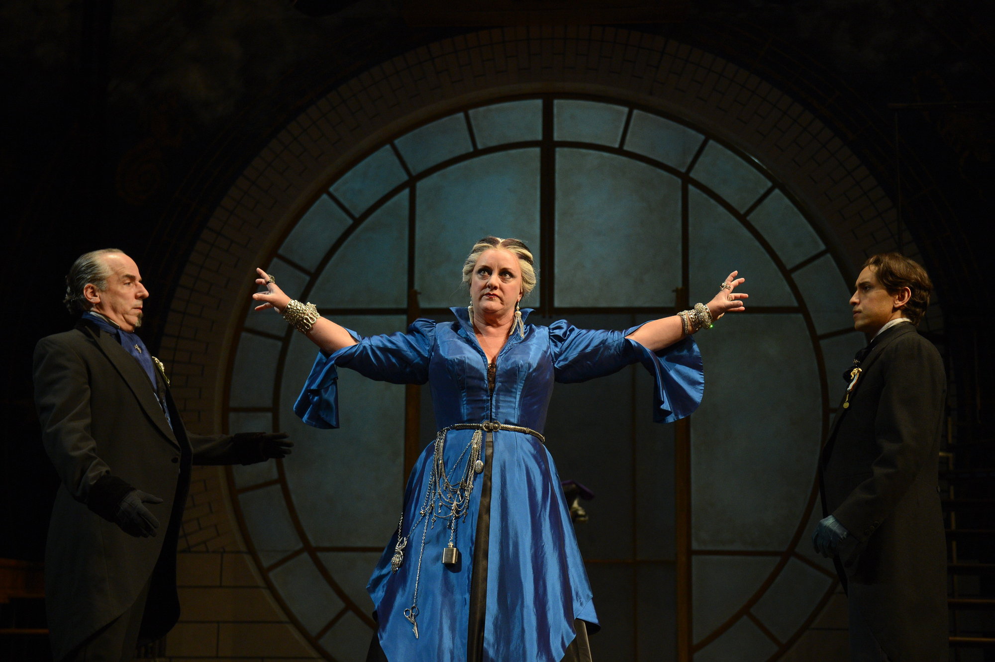 Actor Lori Birmingham (center, as Paulina) holds two lords at bay (actors M.A. Taylor, left and Juan Rivera Lebron, right) in Great Lakes Theater's season opening production of William Shakespeare's romantic epic "The Winter's Tale" at the Hanna Theatre, PlayhouseSquare. The production will run in rotating repertory with a 60s-inspired, music-infused adaptation of Moliere's classic comedy "The Imaginary Invalid" through November 4, 2012. (Photo by Roger Mastroianni)
