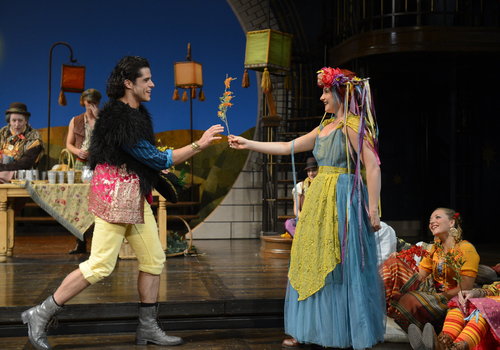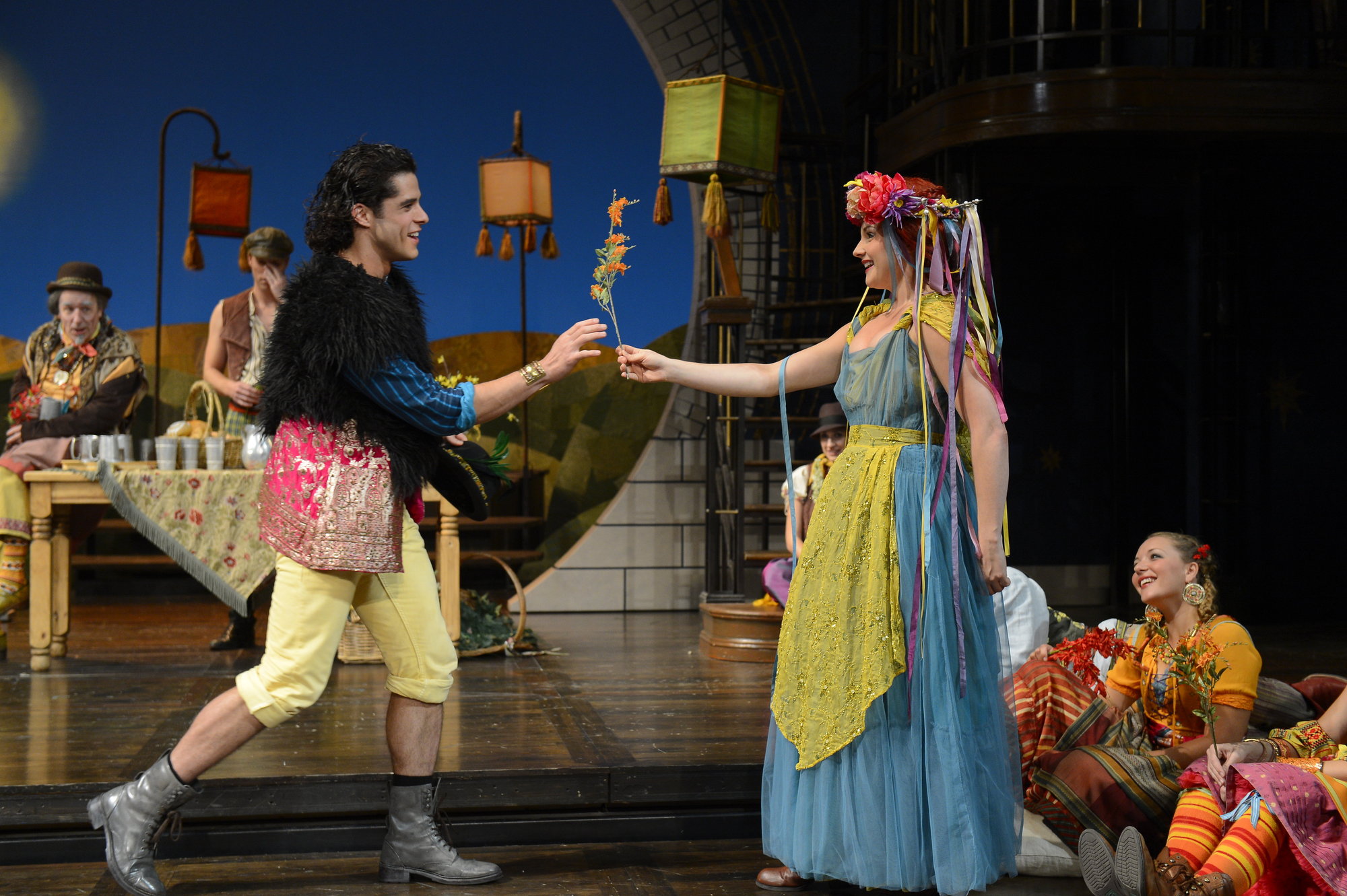 Actors Miles Gaston Villanueva (left, as Florizel) and Kimbre Lancaster (right, as Perdita) share a tender moment in Great Lakes Theater's season opening production of William Shakespeare's romantic epic "The Winter's Tale" at the Hanna Theatre, PlayhouseSquare. The production will run in rotating repertory with a 60s-inspired, music-infused adaptation of Moliere's classic comedy "The Imaginary Invalid" through November 4, 2012. (Photo by Roger Mastroianni)