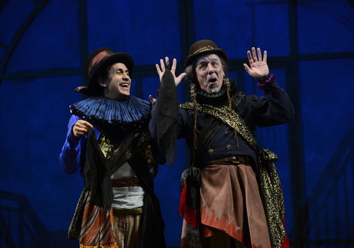 Juan Rivera Lebron (left, as a Clown/son) and M.A. Taylor (right, as an Old Shepherd/father) celebrate their unexpected, new-found wealth in Great Lakes Theater's season opening production of William Shakespeare's romantic epic "The Winter's Tale" at the Hanna Theatre, PlayhouseSquare. The production will run in rotating repertory with a 60s-inspired, music-infused adaptation of Moliere's classic comedy "The Imaginary Invalid" through November 4, 2012. (Photo by Roger Mastroianni)