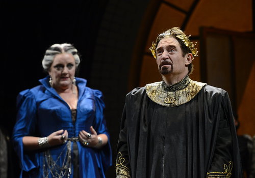 Actors Lise Bruneau (as Hermione) and Lynn Robert Berg (as Polixenes) star in Great Lakes Theater's season opening production of William Shakespeare's romantic epic "The Winter's Tale" at the Hanna Theatre, PlayhouseSquare. The production will run in rotating repertory with a 60s-inspired, music-infused adaptation of Moliere's classic comedy "The Imaginary Invalid" through November 4, 2012. (Photo by Roger Mastroianni)
