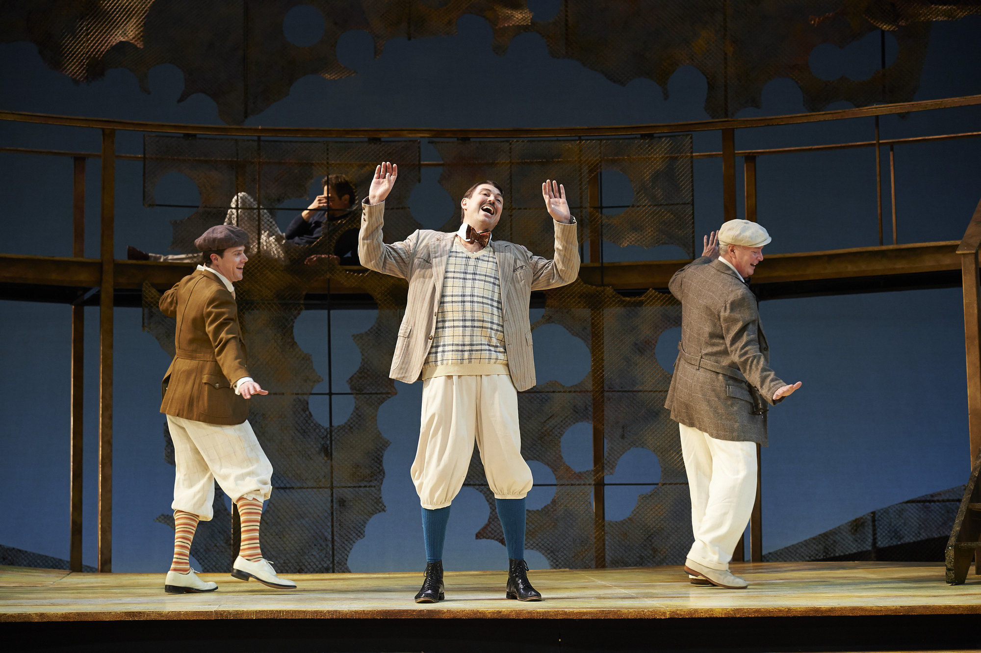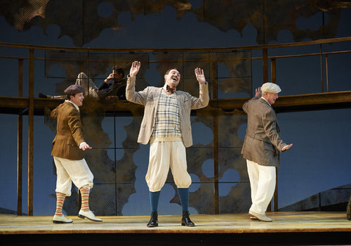 Actors Neil Brookshire (left, as Claudio), Eric Damon Smith (center, as Balthasar) and David McCann (right, as Leonato) revel as J. Todd Adams (up, as Bendick) eavesdrops in the Great Lakes Theater production of Shakespeare's sublime battle of wits and wills "Much Ado About Nothing" at the Hanna Theatre, PlayhouseSquare which runs through April 14. (Photo by Roger Mastroianni)