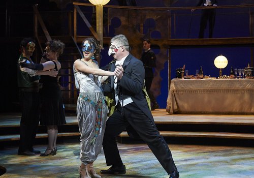 Actors Betsy Mugavero (as Hero) and David Anthony Smith (as Don Pedro) share the spotlight during a masquerade party in the Great Lakes Theater production of Shakespeare's sublime battle of wits and wills "Much Ado About Nothing" at the Hanna Theatre, PlayhouseSquare which runs through April 14. (Photo by Roger Mastroianni)