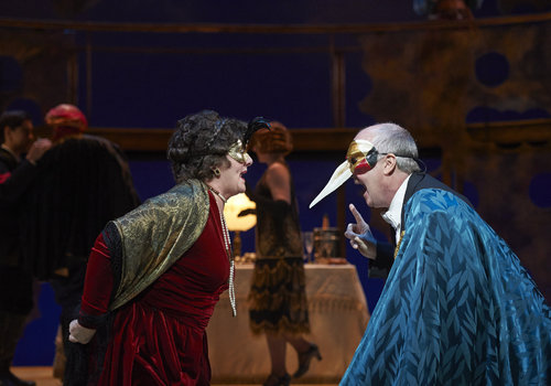 Actors Laurie Birmingham (as Antonia) and David McCann (as Leonato) share a smile during a masquerade party in the Great Lakes Theater production of Shakespeare's sublime battle of wits and wills "Much Ado About Nothing" at the Hanna Theatre, PlayhouseSquare which runs through April 14. (Photo by Roger Mastroianni)
