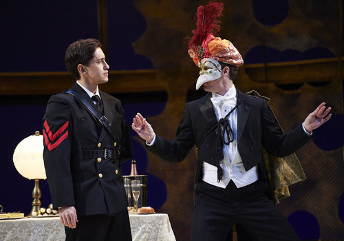 Comedy and tragedy ironically collide when actors Juan Rivera Lebron (left, as Don John) and Neil Brookshire (right, as Claudio) meet during a moment at a masquerade party in the Great Lakes Theater production of Shakespeare's sublime battle of wits and wills "Much Ado About Nothing" at the Hanna Theatre, PlayhouseSquare which runs through April 14. (Photo by Roger Mastroianni)