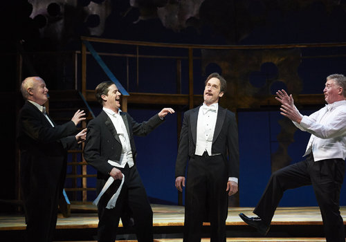 The bachelor Benedick (actor, third from left, J. Todd Adams) is "busted" by his conspiring cronies Leonato (actor, first from left, David McCann), Claudio (actor, second from left, Neil Brookshire) and Don Pedro (actor, right, David Anthony Smith) in the Great Lakes Theater production of Shakespeare's sublime battle of wits and wills "Much Ado About Nothing" at the Hanna Theatre, PlayhouseSquare which runs through April 14. (Photo by Roger Mastroianni)