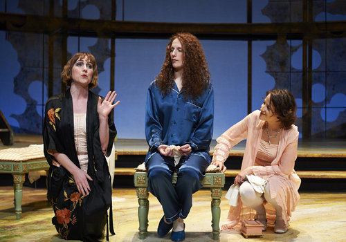 Actors Maggie Kettering (left, as Margaret), Cassandra Bissell (center, as Beatrice) and Betsy Mugavero (as Hero) share a private moment on stage in the Great Lakes Theater production of Shakespeare's sublime battle of wits and wills "Much Ado About Nothing" at the Hanna Theatre, PlayhouseSquare which runs through April 14. (Photo by Roger Mastroianni)