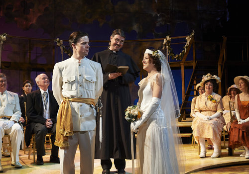 Until death do us part? Actor Neil Brookshire (left, as Claudio) suspiciously eyes his bride-to-be, actor Betsy Mugavero (as Hero) as an unsuspecting adjudicator, actor Eric Damon Smith (center, as Friar Francis) watches on in the Great Lakes Theater production of Shakespeare's sublime battle of wits and wills "Much Ado About Nothing" at the Hanna Theatre, PlayhouseSquare which runs through April 14. (Photo by Roger Mastroianni)