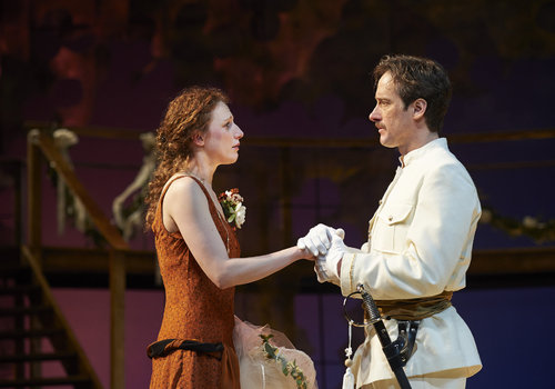 Actors Cassandra Bissell (as Beatrice) and J. Todd Adams (as Benedick) share a tender moment in the Great Lakes Theater production of Shakespeare's sublime battle of wits and wills "Much Ado About Nothing" at the Hanna Theatre, PlayhouseSquare which runs through April 14. (Photo by Roger Mastroianni)