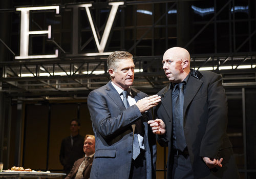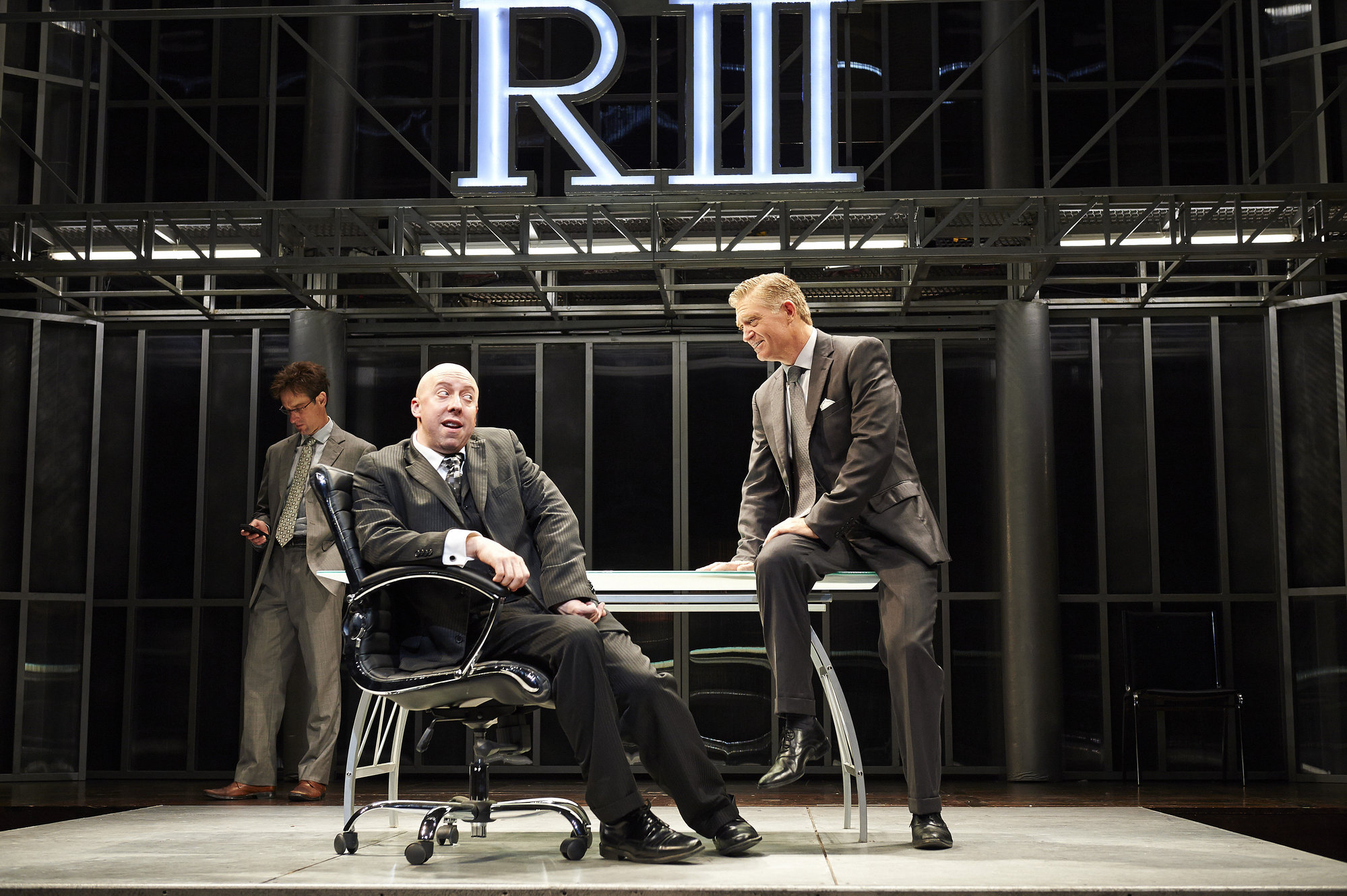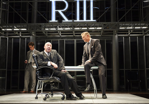 Actors David Anthony Smith (left, as the Duke of Buckingham) and Lynn Robert Berg (right, as Richard) take center stage in the Great Lakes Theater production of Shakespeare's royal epic "Richard III" at the Hanna Theatre, PlayhouseSquare which runs through November 3. (Photo by Roger Mastroianni)