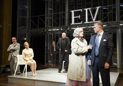 Actors Laurie Birmingham (front, left as Queen Margaret) and David Anthony Smith (front, right as the Duke of Buckingham) take center stage as current and future royalty look on in the Great Lakes Theater production of Shakespeare's royal epic "Richard III" at the Hanna Theatre, PlayhouseSquare which runs through November 3. (Photo by Roger Mastroianni)