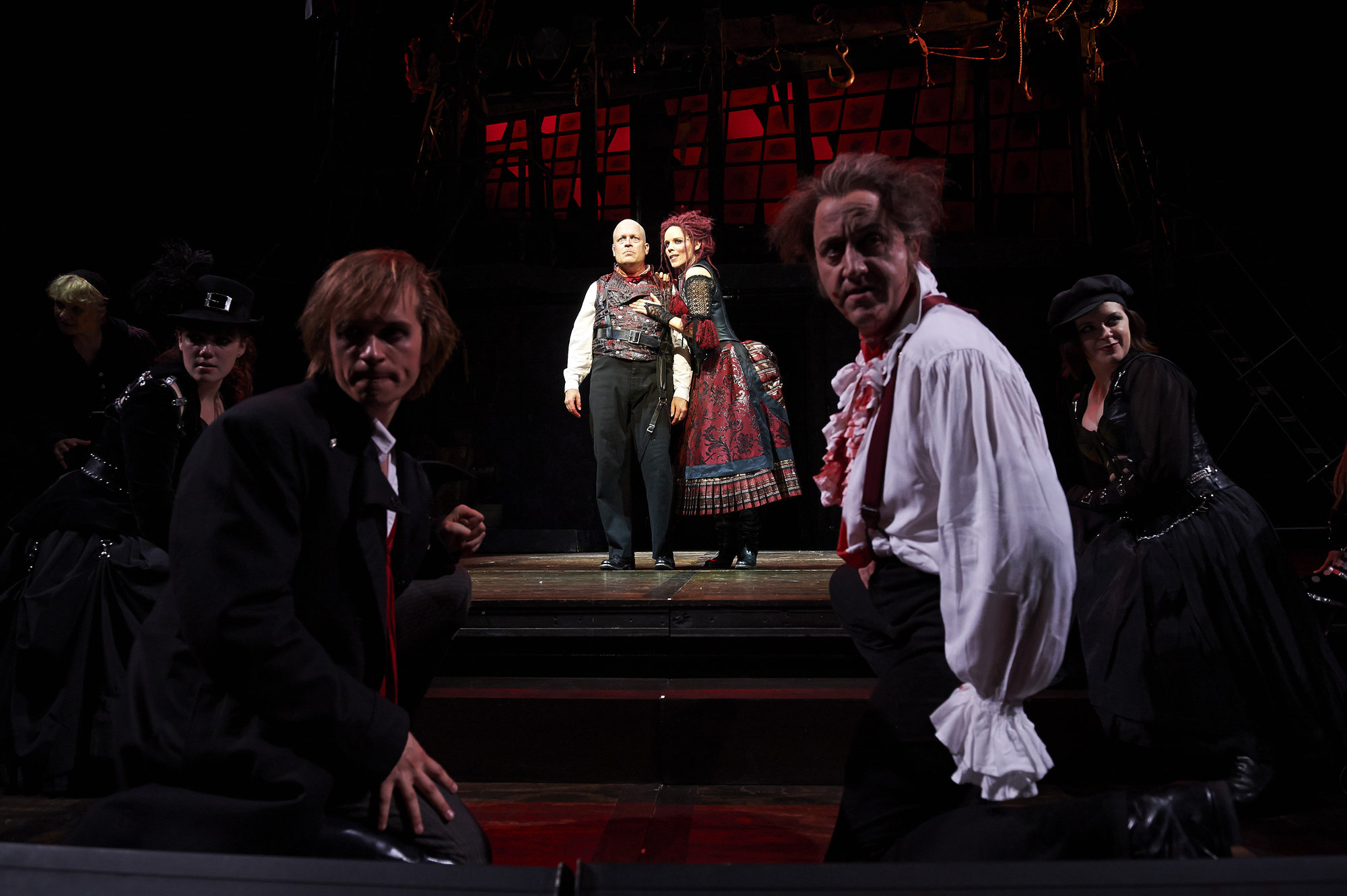 Actors Tom Ford (center, left, as Sweeney Todd) and Sara M. Bruner (center, right, as Mrs. Lovett) are flanked by Zach Adkins (left, as Anthony Hope) and Darren Matthias (right, as Judge Turpin) during a final moment in the Great Lakes Theater production of "Sweeney Todd" at the Hanna Theatre, PlayhouseSquare which runs through November 2. (Photo by Roger Mastroianni)