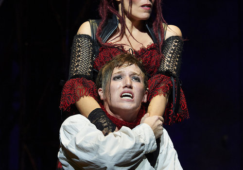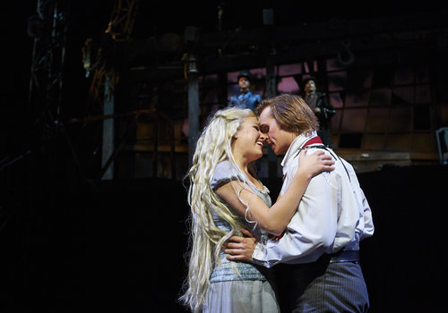 Actors Clare Howes Eisentrout (left, as Johanna) and Zach Adkins (right, as Anthony Hope) take center stage in the Great Lakes Theater production of "Sweeney Todd" at the Hanna Theatre, PlayhouseSquare which runs through November 2. (Photo by Roger Mastroianni)