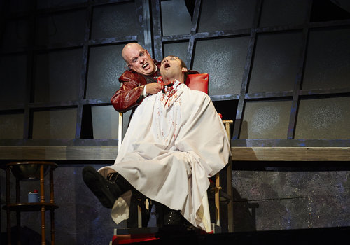 Actor Tom Ford (left, as Sweeney Todd) dispatches another victim, actor Alex Syiek (right) in the Great Lakes Theater production of "Sweeney Todd" at the Hanna Theatre, PlayhouseSquare which runs through November 2. (Photo by Roger Mastroianni)