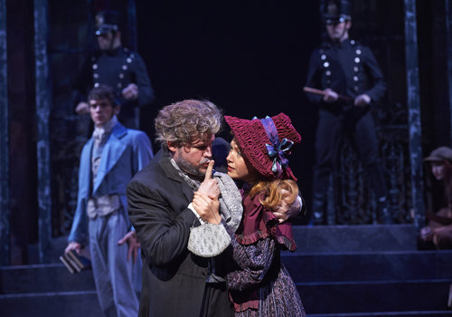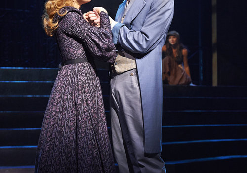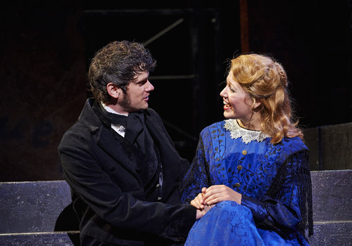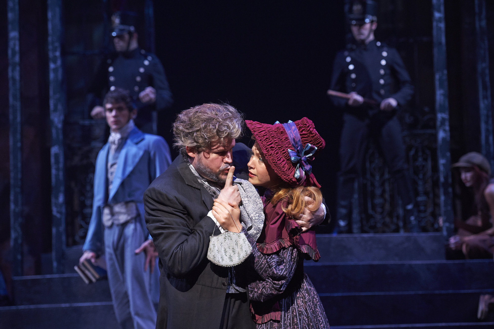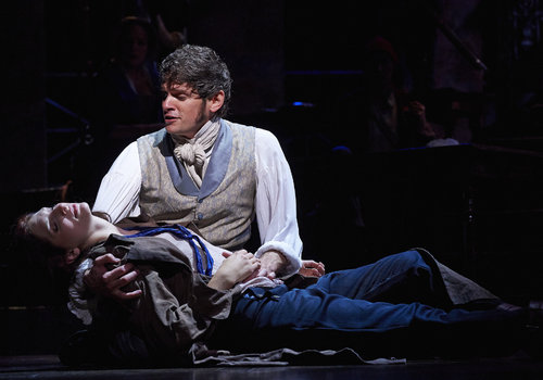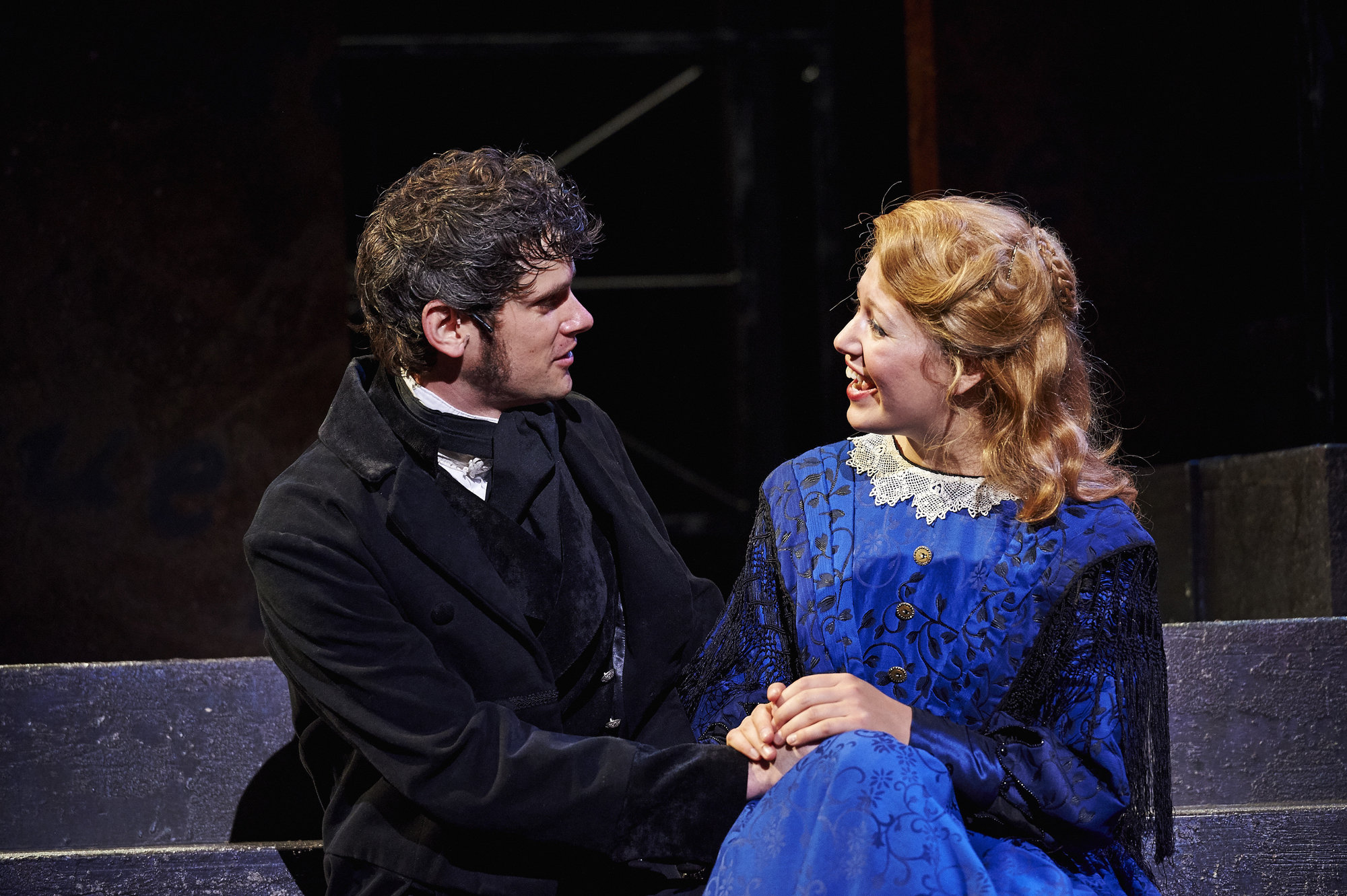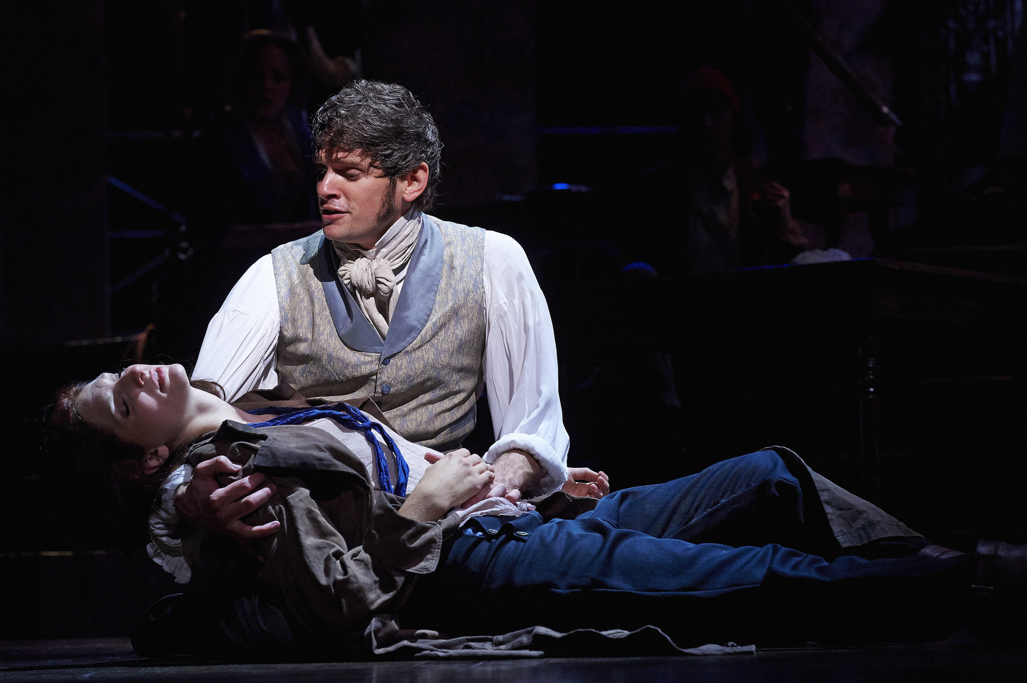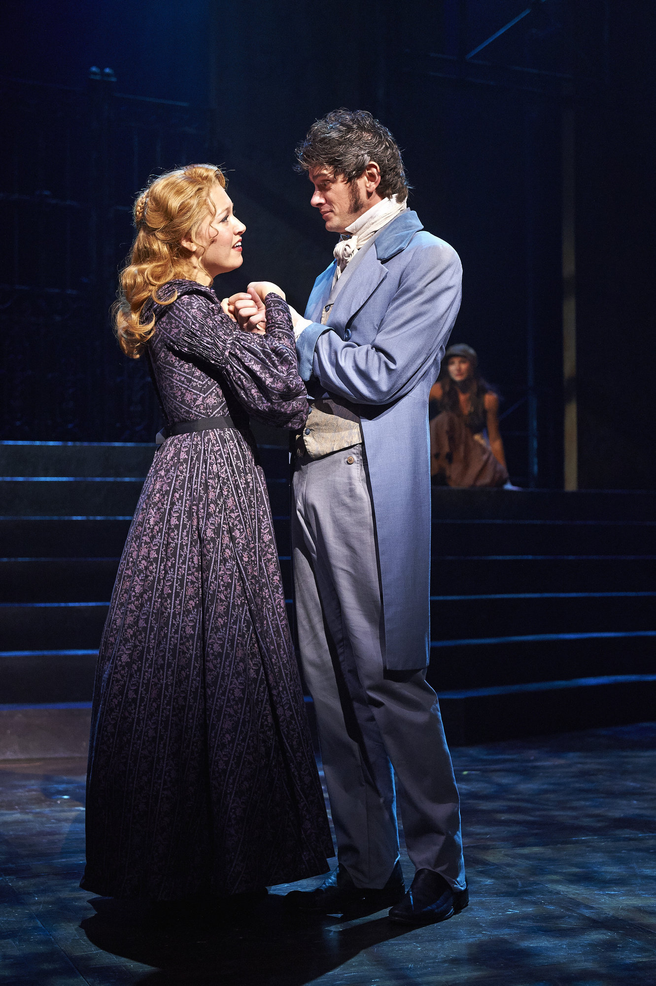Actors Pedar Benson Bate (as Marius) and Clare Howes Eisentrout (as Cosette) share a tender moment in the Great Lakes Theater production of the Tony Award-winning musical epic LES MISÉRABLES at the Hanna Theatre, PlayhouseSquare which runs through November 9. (Photo by Roger Mastroianni)