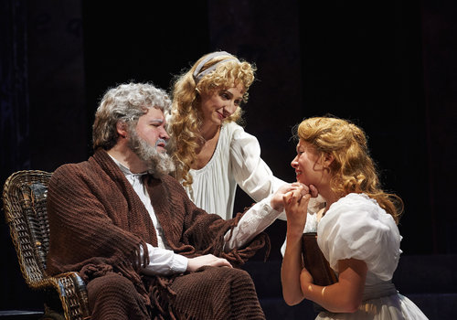 A family is briefly reunited when actors Stephen Mitchell Brown (left, as Jean Valjean), Jodi Dominick (top, as Fantine) and Clare Howes Eisentrout (right, as Cosette) share a tender final moment in the Great Lakes Theater production of the Tony Award-winning musical epic LES MISERABLES at the Hanna Theatre, PlayhouseSquare which runs through November 9. (Photo by Roger Mastroianni)
