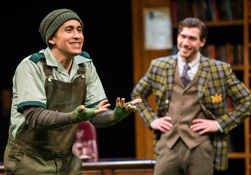 Actors Juan Rivera Lebron (left, as Costard) and Nick Steen (right, as Dumaine) share the spotlight in the Great Lakes Theater production of William Shakespeare's classic comedy LOVE'S LABOUR'S LOST at the Hanna Theatre, Playhouse Square which runs through April 24. (Photo by Ken Blaze)