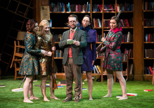 Actors (from left to right) Laura Welsh Berg (as Rosaline), Erin Partin (as Princess of France), Chris Klopatek (as Boyet), Heather Thiry (as Katherine) and Christine Weber (as Maria) share the spotlight in the Great Lakes Theater production of William Shakespeare's classic comedy LOVE'S LABOUR'S LOST at the Hanna Theatre, Playhouse Square which runs through April 24. (Photo by Ken Blaze)