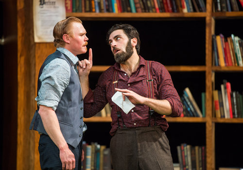 Actors Jonathan Dyrud (left, as Ferdinand) and Christopher Tocco (right, as Berowne) share the spotlight in the Great Lakes Theater production of William Shakespeare's classic comedy LOVE'S LABOUR'S LOST at the Hanna Theatre, Playhouse Square which runs through April 24. (Photo by Ken Blaze)