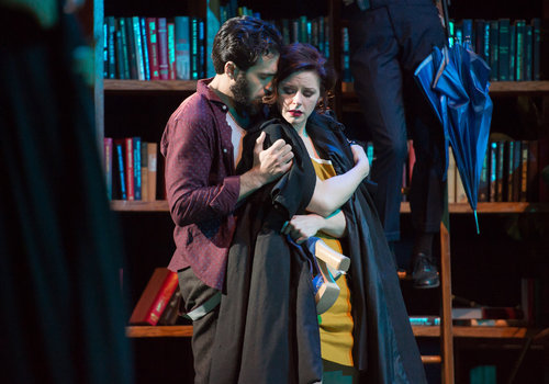 Actors Christopher Tocco (as Berowne) and Laura Welsh Berg (as Rosaline) share a tender moment in the Great Lakes Theater production of William Shakespeare's classic comedy LOVE'S LABOUR'S LOST at the Hanna Theatre, Playhouse Square which runs through April 24. (Photo by Ken Blaze)