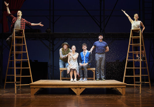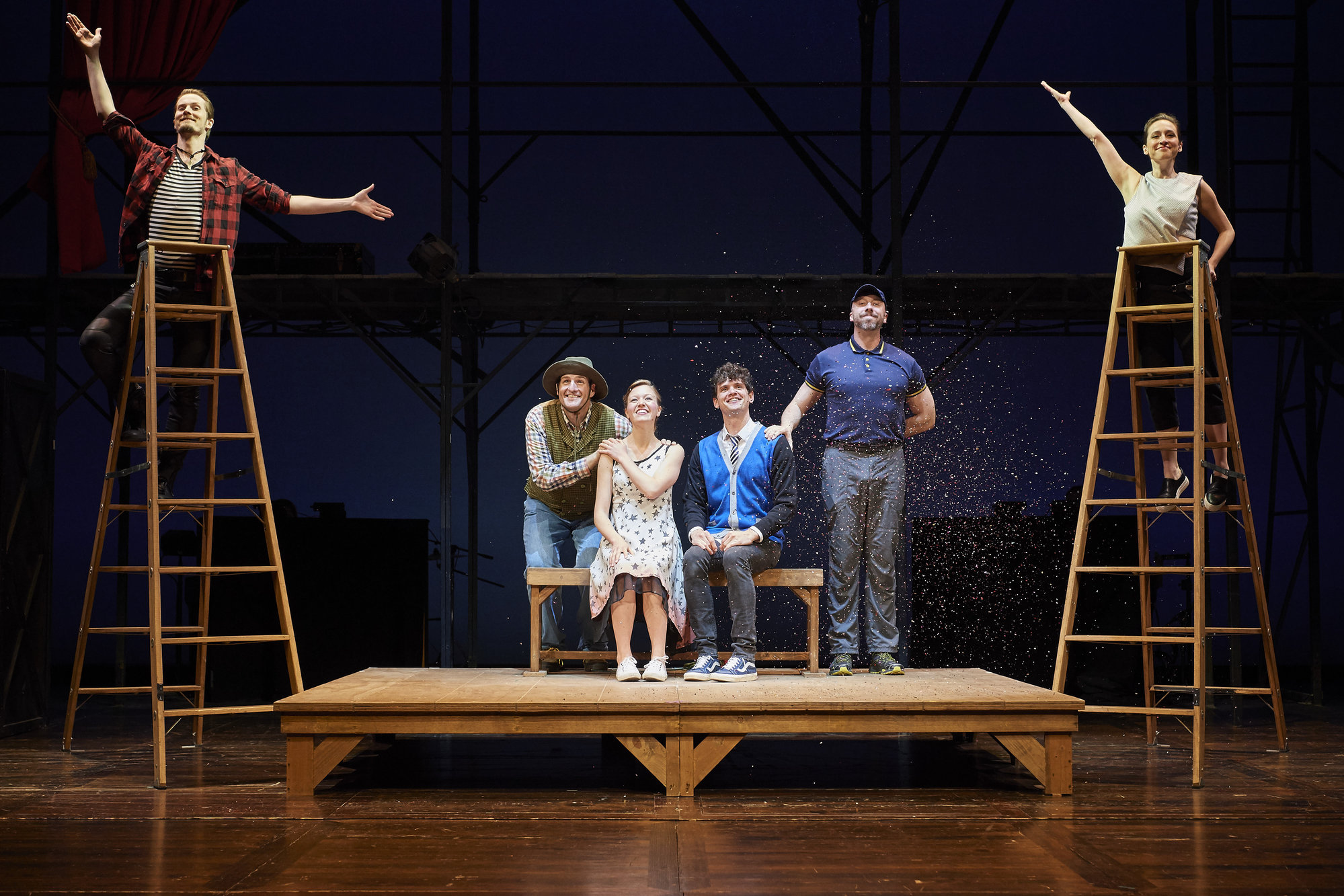 An exceptional ensemble comprised of (from left to right) Michael Padgett, Justin Ness, Clare Howes Eisentrout, Pedar Benson Bate, Lynn Robert Berg and Meredith Lark shares the spotlight in the Great Lakes Theater production of THE FANTASTICKS at the Hanna Theatre, Playhouse Square which runs through May 29. (Photo by Roger Mastroianni)