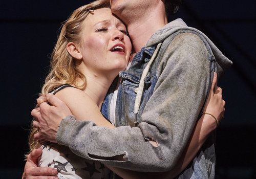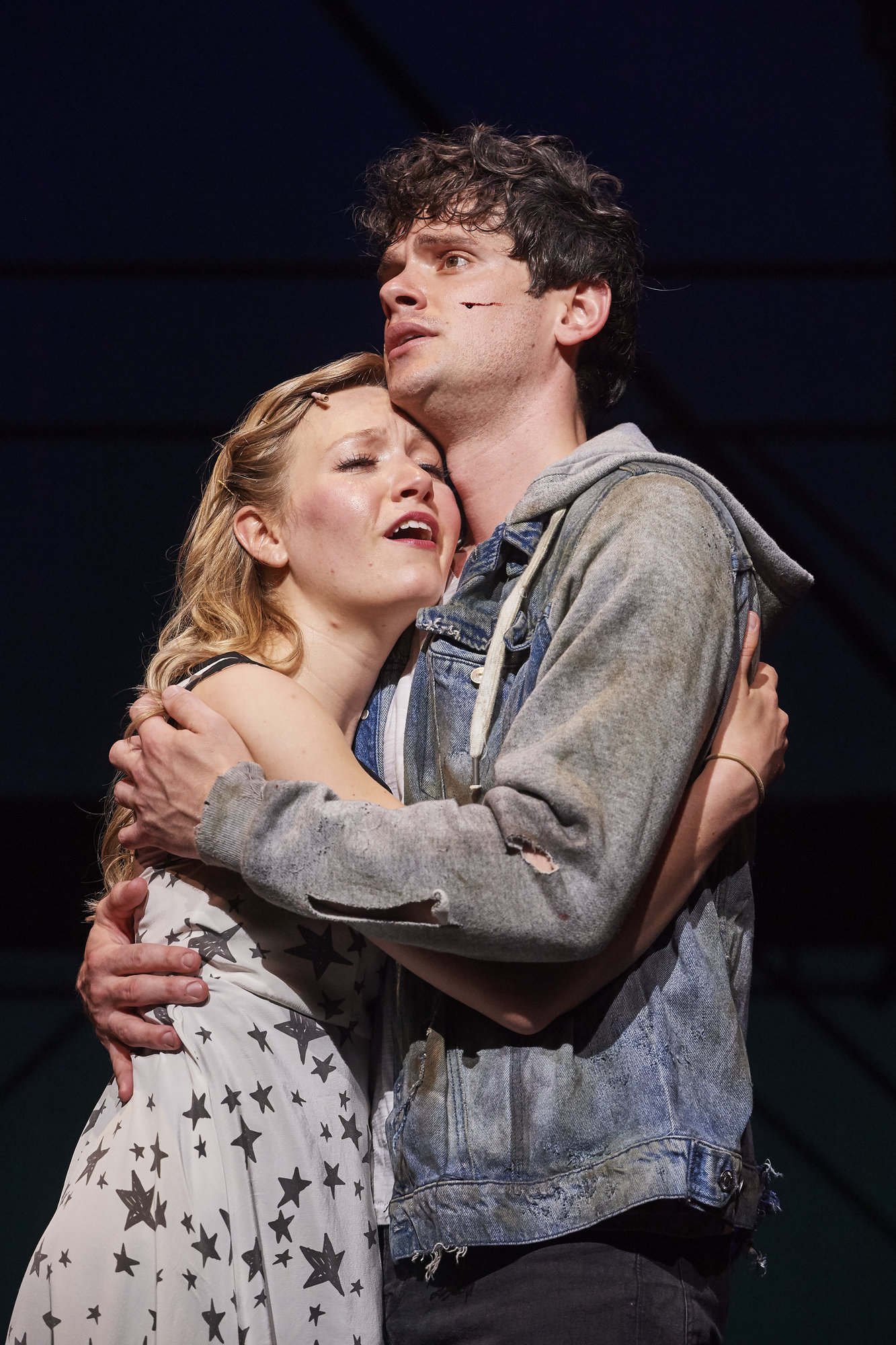 Luisa (actor, Clare Howes Eisentrout) and El Gallo (actor, Michael Padgett) share a tender moment in the Great Lakes Theater production of THE FANTASTICKS at the Hanna Theatre, Playhouse Square which runs through May 29. (Photo by Roger Mastroianni)