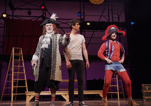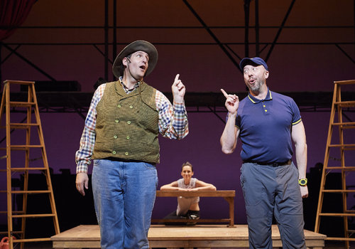 Henry (actor, Aled Davies, left) and Mortimer (actor, Jeffrey C. Hawkins, right) share a comic moment to the dismay of Matt (actor, Pedar Benson Bate, center) in the Great Lakes Theater production of THE FANTASTICKS at the Hanna Theatre, Playhouse Square which runs through May 29. (Photo by Roger Mastroianni)