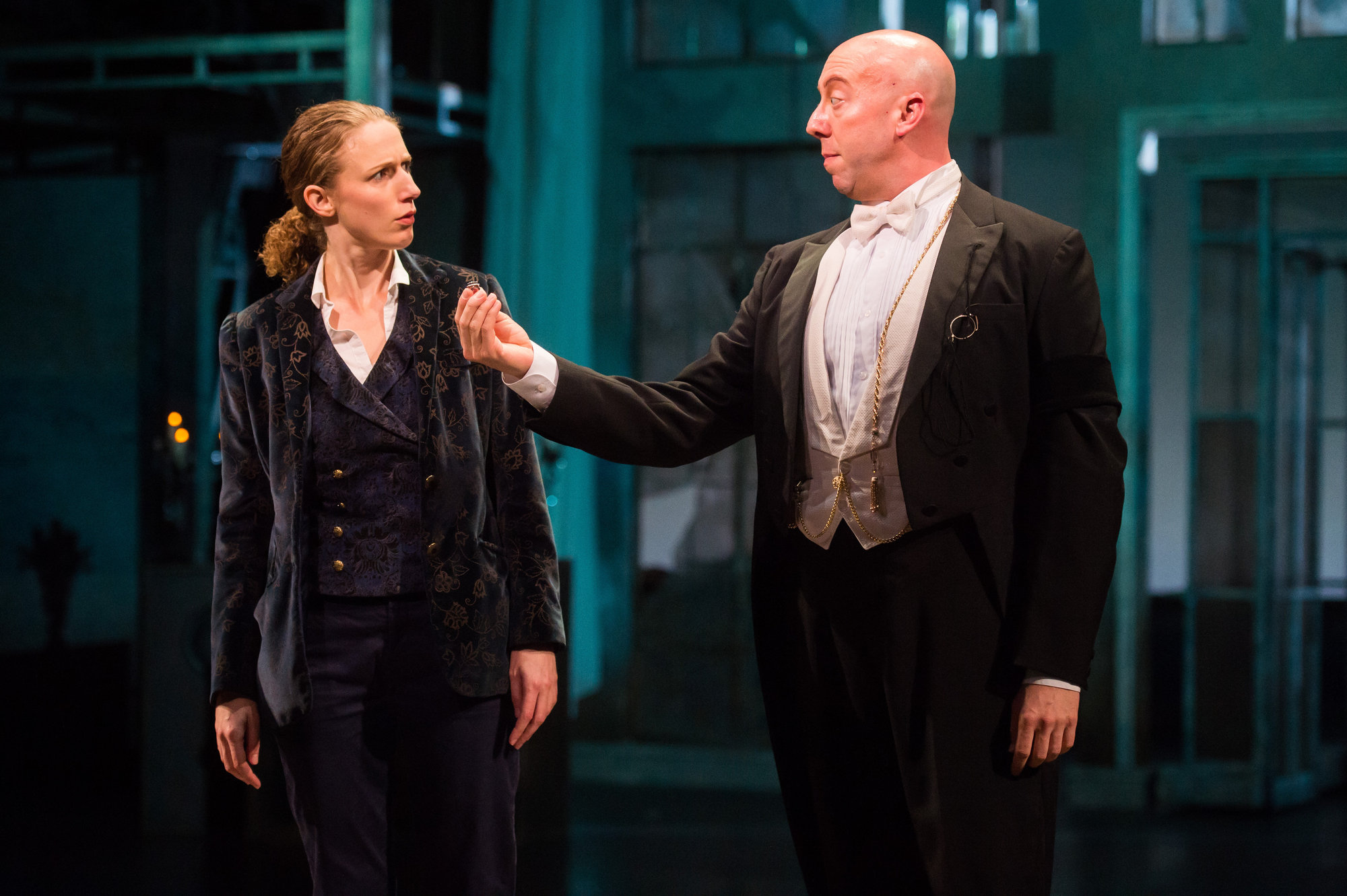 Viola (actor, Cassandra Bissell) and Malvolio (actor, Lynn Robert Berg) share the spotlight in the Great Lakes Theater production of TWELFTH NIGHT at the Hanna Theatre, Playhouse Square which runs through October 30. (Photo by Ken Blaze)