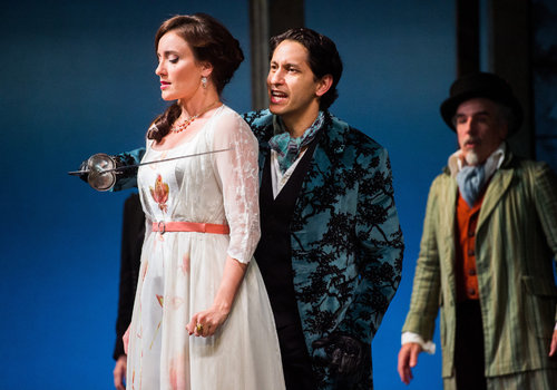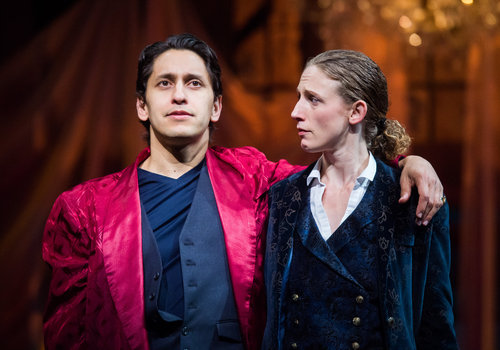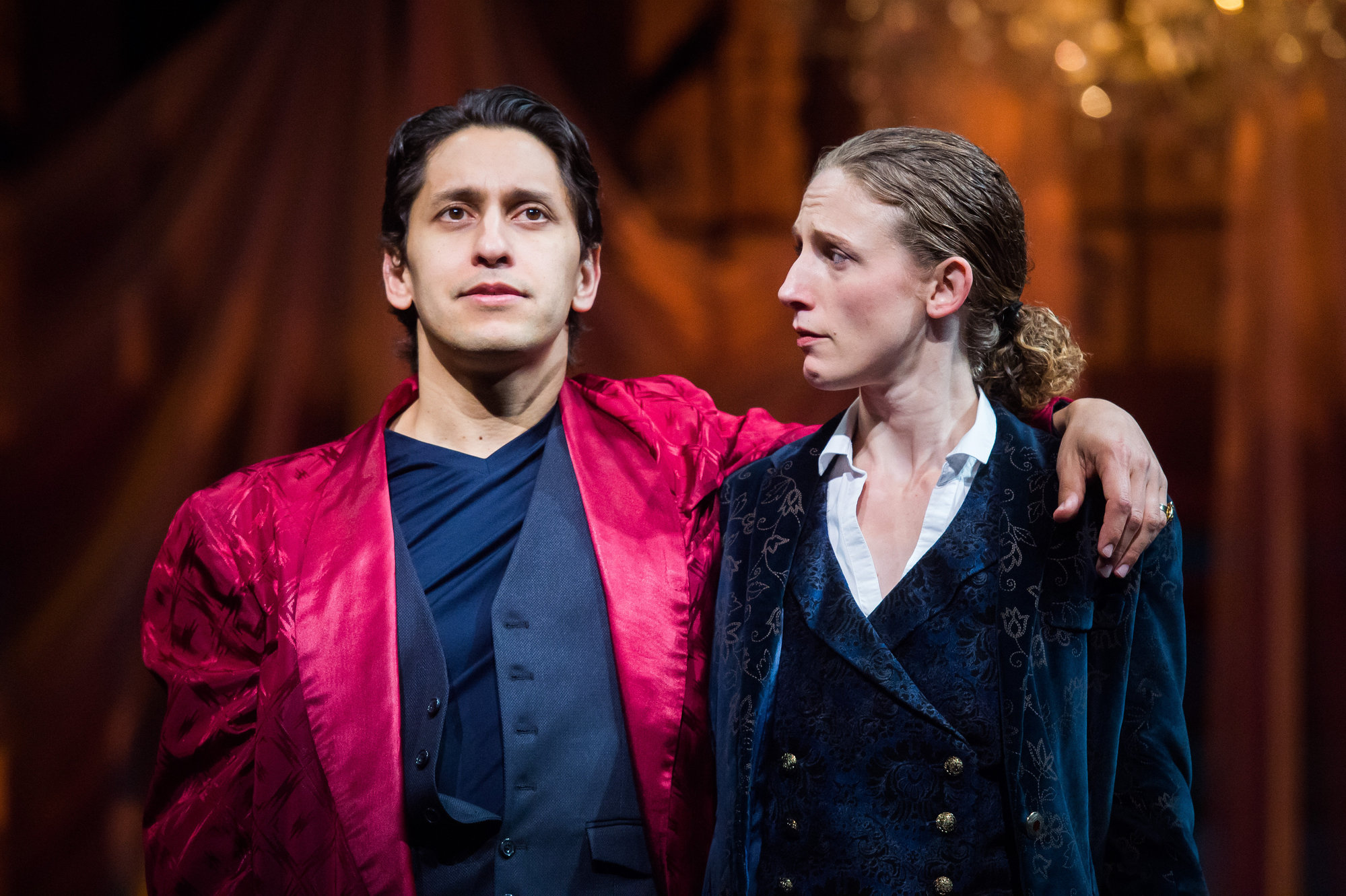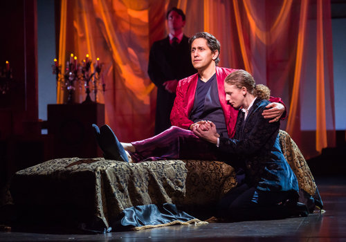 Orsino (actor, Juan Rivera Lebron) and Viola (actor, Cassandra Bissell) share a tender moment in the Great Lakes Theater production of TWELFTH NIGHT at the Hanna Theatre, Playhouse Square which runs through October 30. (Photo by Ken Blaze)