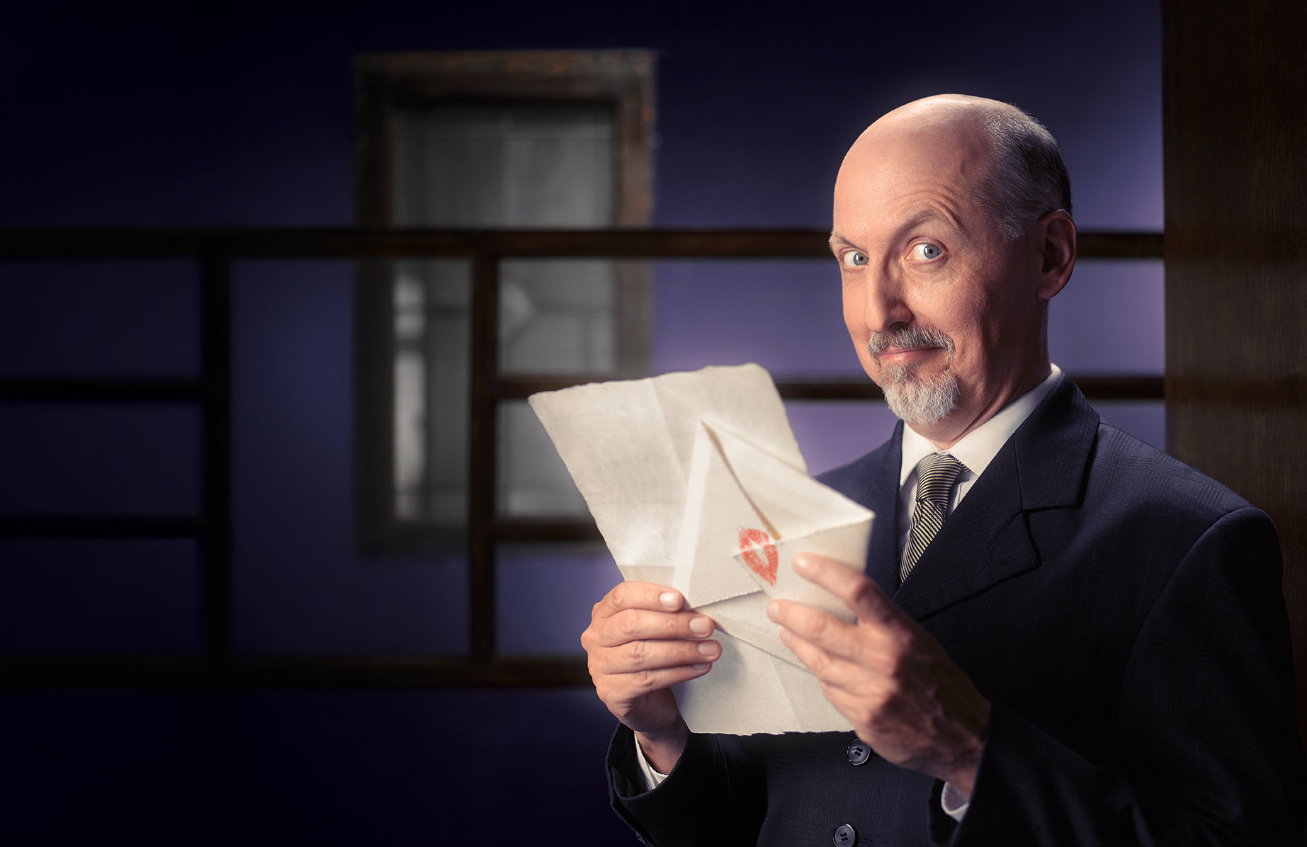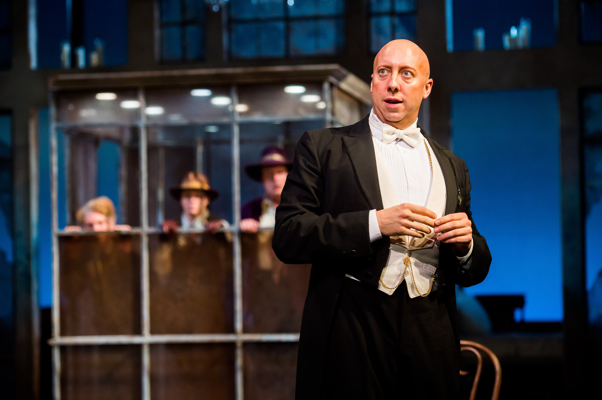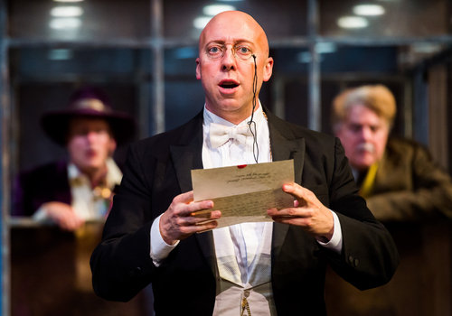 Malvolio (actor, Lynn Robert Berg, foreground) attempts to solve a puzzle as pranksters Sir Toby Belch (actor, Aled Davies, left background), Fabian (actor, Laura Welsh Berg, center background) and Sir Andrew Aguecheek (actor, Tom Ford, right background) observe in the Great Lakes Theater production of TWELFTH NIGHT at the Hanna Theatre, Playhouse Square which runs through October 30. (Photo by Ken Blaze)