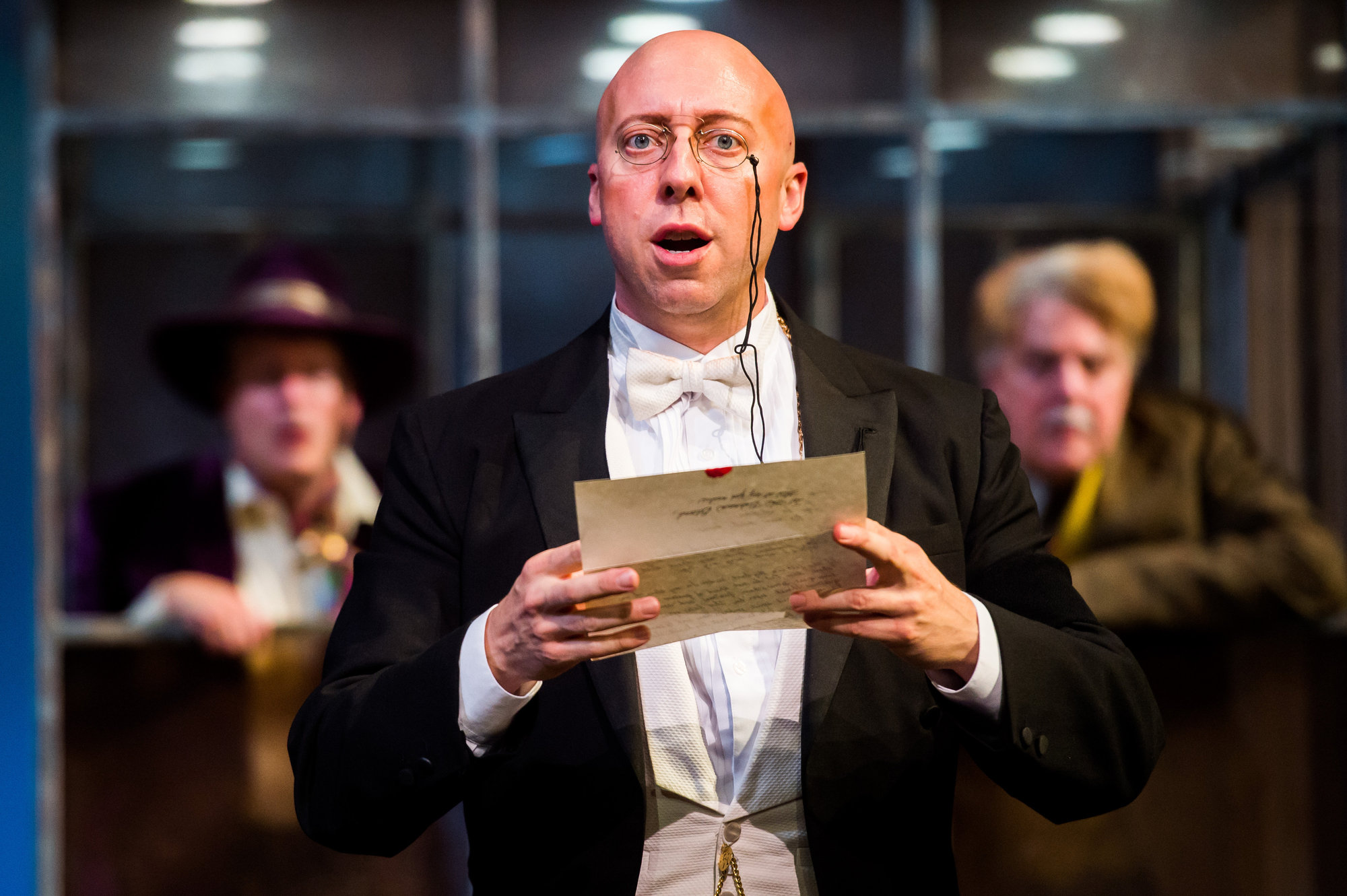Malvolio (actor, Lynn Robert Berg, center) attempts to solve a puzzle as pranksters Sir Andrew Aguecheek (actor, Tom Ford, left) and Sir Toby Belch (actor, Aled Davies, right) observe in the Great Lakes Theater production of TWELFTH NIGHT at the Hanna Theatre, Playhouse Square which runs through October 30. (Photo by Ken Blaze)