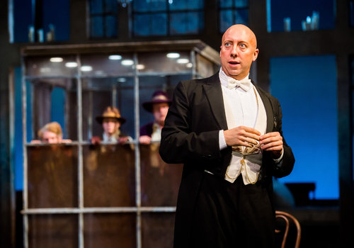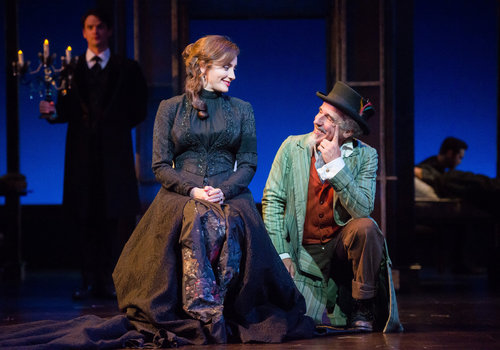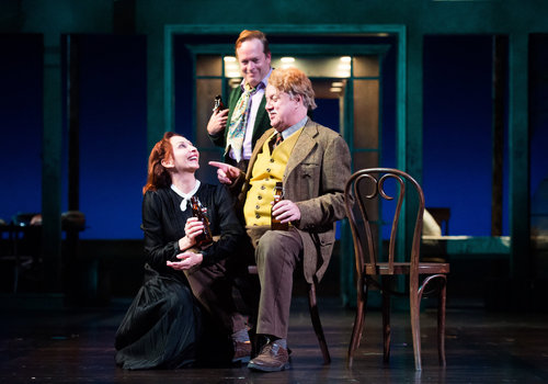 Maria (actor, Laura Perrotta, left), Sir Andrew Aguecheek (actor, Tom Ford, above) and Sir Toby Belch (actor, Aled Davies, right) make merry in the Great Lakes Theater production of TWELFTH NIGHT at the Hanna Theatre, Playhouse Square which runs through October 30. (Photo by Ken Blaze)