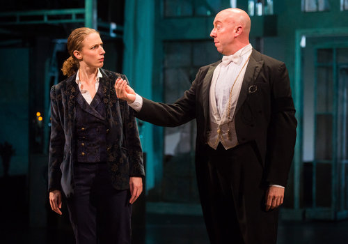 Orsino (actor, Juan Rivera Lebron) threatens Olivia (actor, Christine Weber) in the Great Lakes Theater production of TWELFTH NIGHT at the Hanna Theatre, Playhouse Square which runs through October 30. (Photo by Ken Blaze)