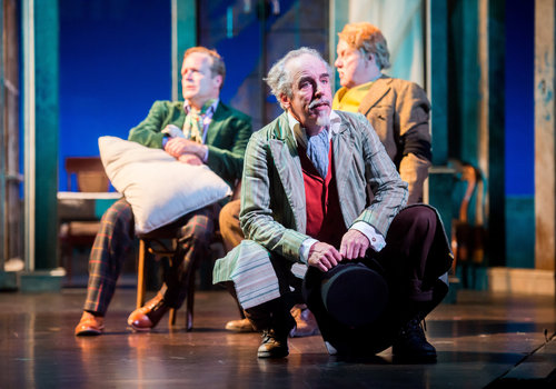 Feste (actor, M.A. Taylor, center) waxes poetic as Sir Andrew Aguecheek (actor, Tom Ford, left) and Sir Toby Belch (actor, Aled Davies, right) observe in the Great Lakes Theater production of TWELFTH NIGHT at the Hanna Theatre, Playhouse Square which runs through October 30. (Photo by Ken Blaze)