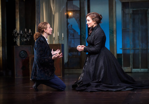 Viola (actor, Cassandra Bissell, left) and Olivia (actor, Christine Weber, right) share a tender moment in the Great Lakes Theater production of TWELFTH NIGHT at the Hanna Theatre, Playhouse Square which runs through October 30. (Photo by Ken Blaze)