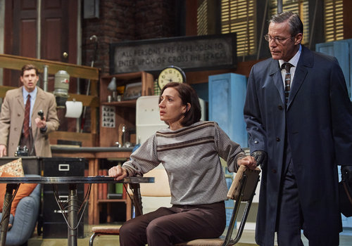 Mike Talman (actor, Nick Steen, left), Sgt. Carlino (actor, David Anthony Smith, center) and Harry Roat (actor, Arthur Hanket, right) in the Great Lakes Theater production of WAIT UNTIL DARK at the Hanna Theatre, Playhouse Square which runs through March 12 (Photo by Roger Mastroianni)