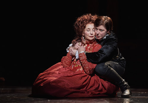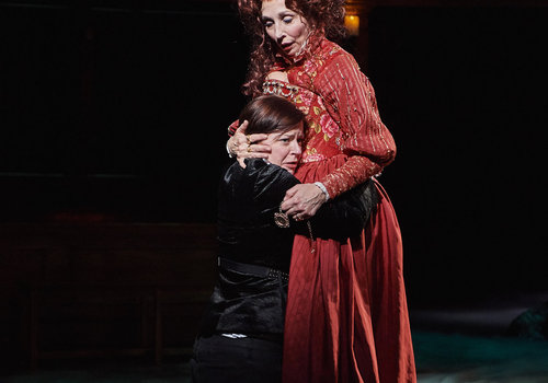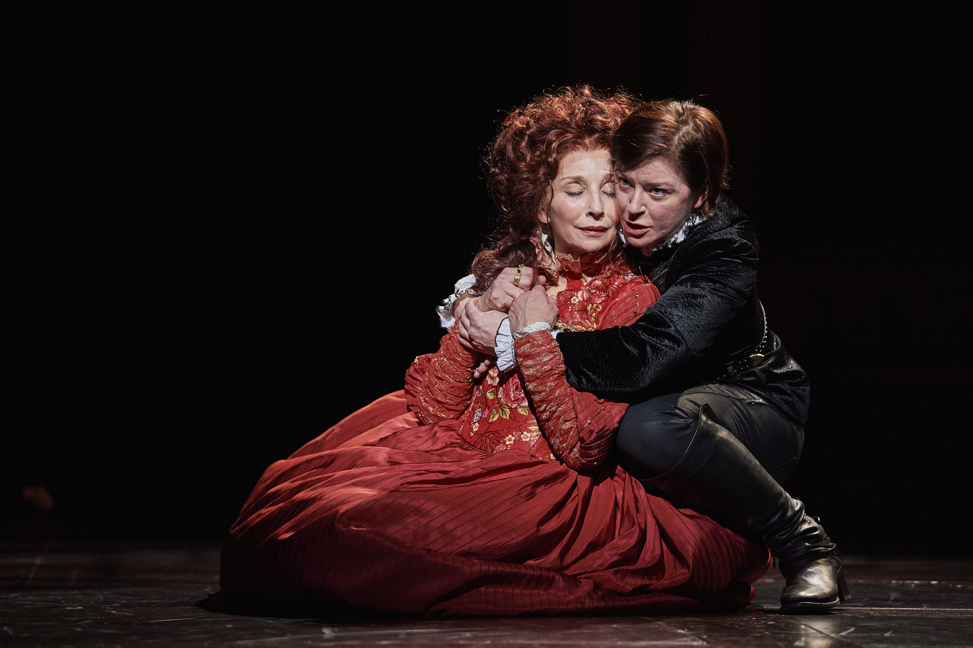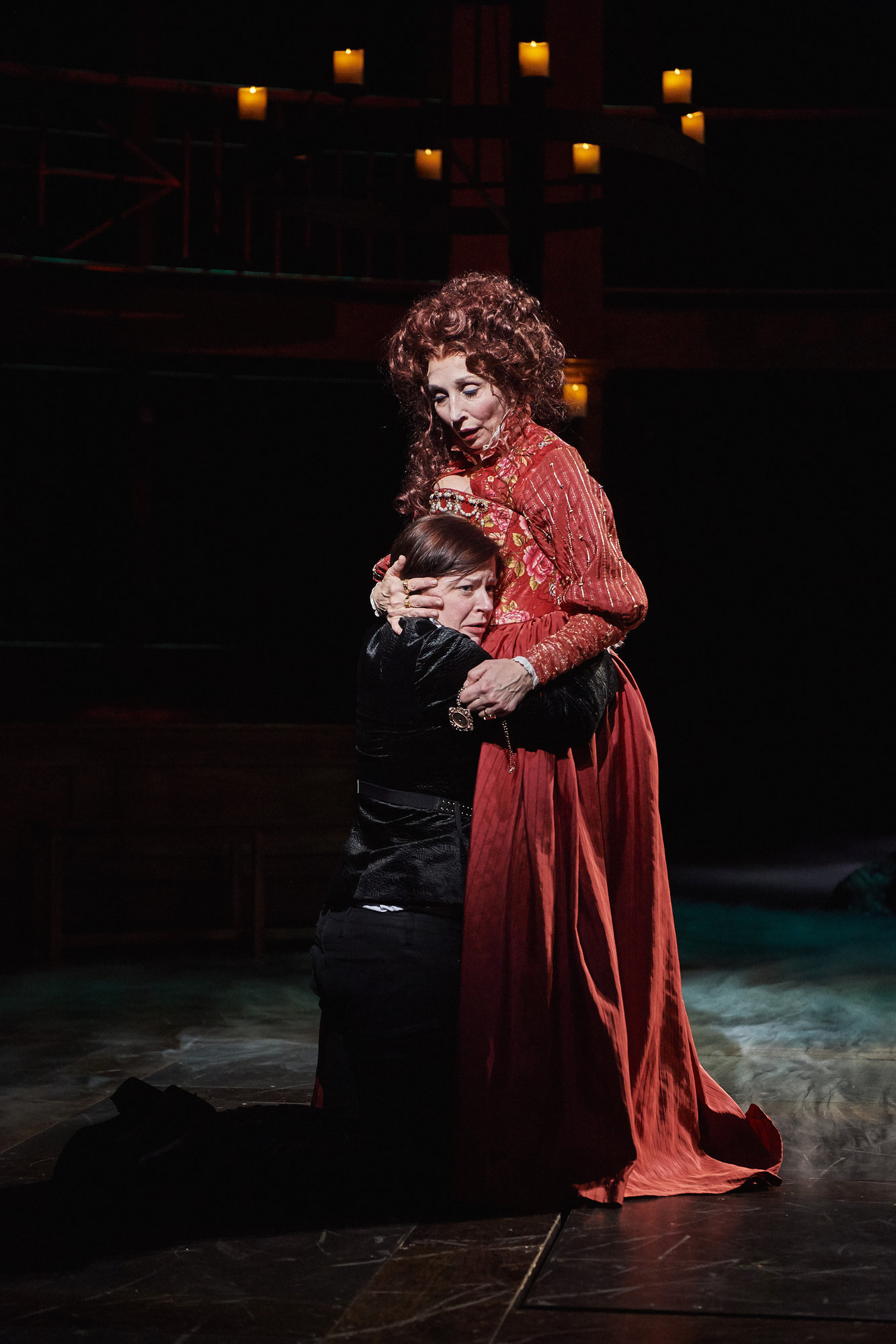 Gertrude (actor, Laura Perrotta, left) and Hamlet (actor, Laura Welsh Berg, right) in the Great Lakes Theater production of HAMLET at the Hanna Theatre, Playhouse Square which runs through April 15 (Photo by Roger Mastroianni)