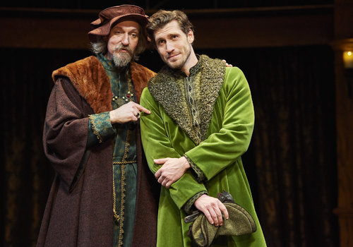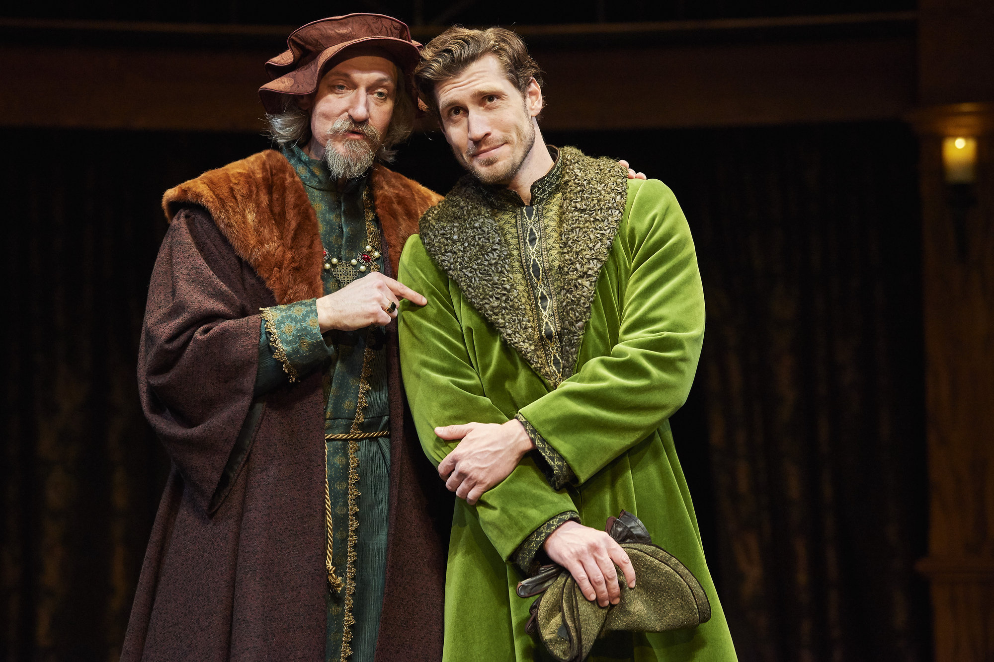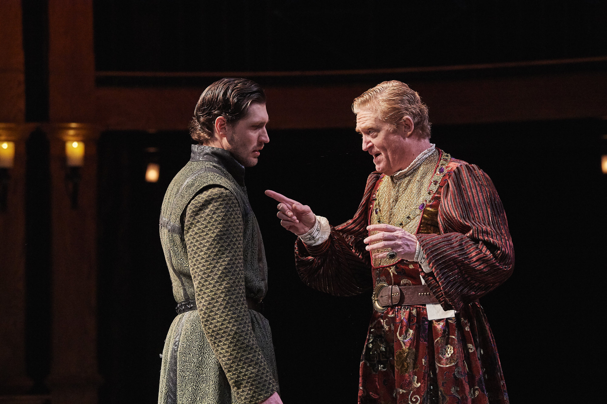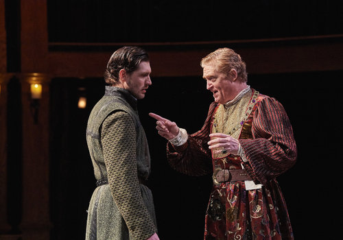 Polonius (actor, Dougfred Miller, left) and Laertes (actor, Nick Steen, right) in the Great Lakes Theater production of HAMLET at the Hanna Theatre, Playhouse Square which runs through April 15 (Photo by Roger Mastroianni)