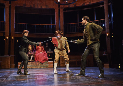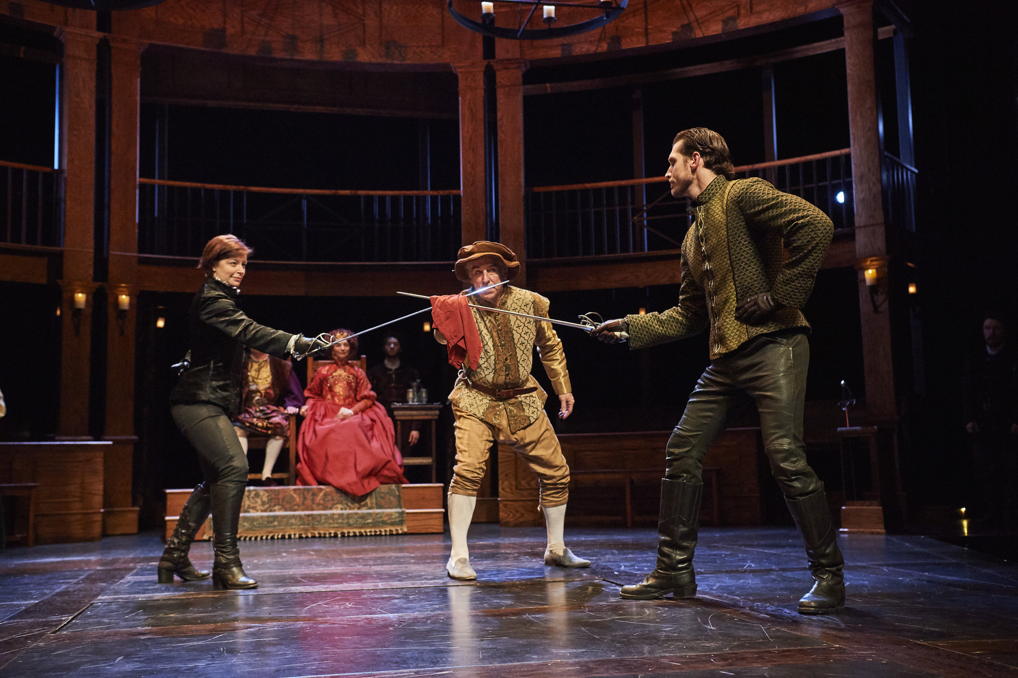 Hamlet (actor, Laura Welsh Berg, left), Laertes (actor, Nick Steen, right) and Reynaldo (actor, M.A. Taylor, center) in the Great Lakes Theater production of HAMLET at the Hanna Theatre, Playhouse Square which runs through April 15 (Photo by Roger Mastroianni)