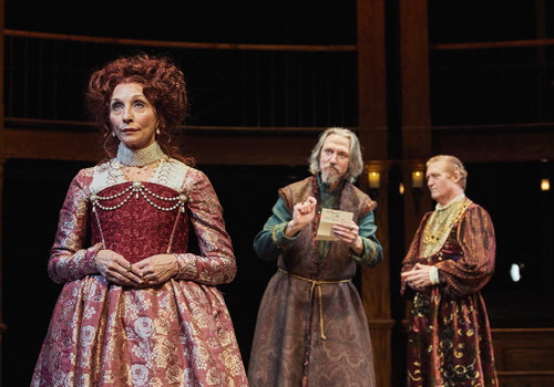 Gertrude (actor, Laura Perrotta, left), Polonius (actor, Dougfred Miller, center) and the King of Denmark (actor, David Anthony Smith, right) in the Great Lakes Theater production of HAMLET at the Hanna Theatre, Playhouse Square which runs through April 15 (Photo by Roger Mastroianni)