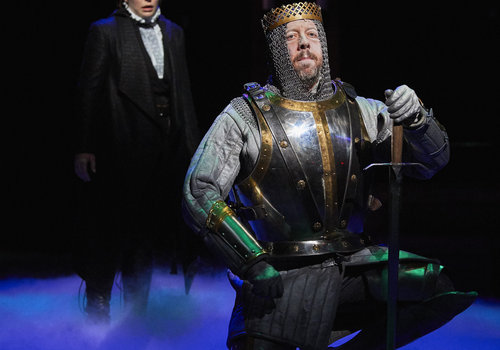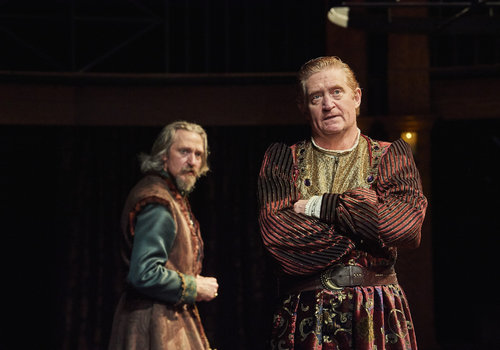 Polonius (actor, Dougfred Miller, left) and the King of Denmark (actor, David Anthony Smith, right) in the Great Lakes Theater production of HAMLET at the Hanna Theatre, Playhouse Square which runs through April 15 (Photo by Roger Mastroianni)