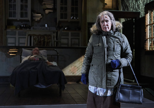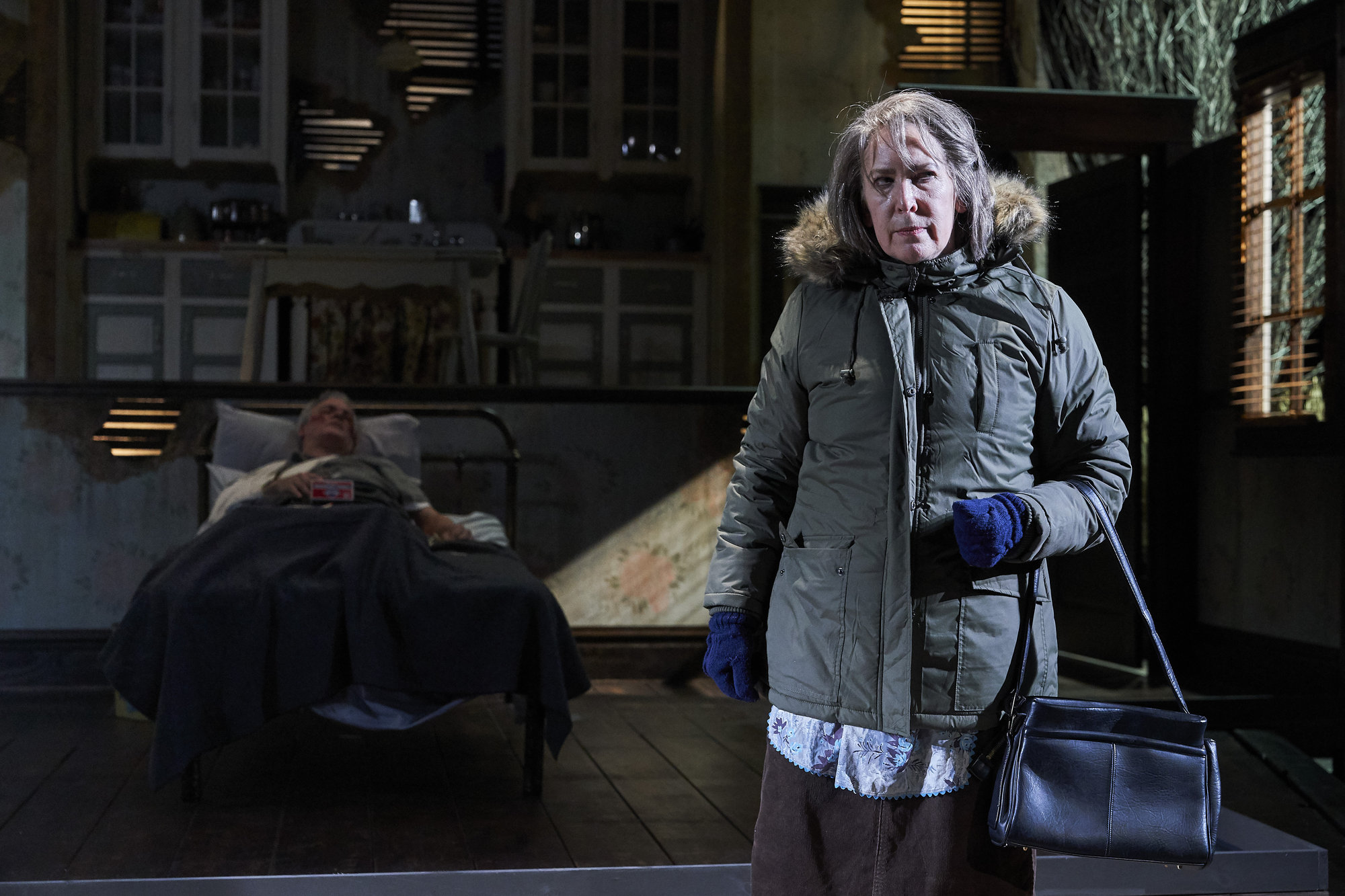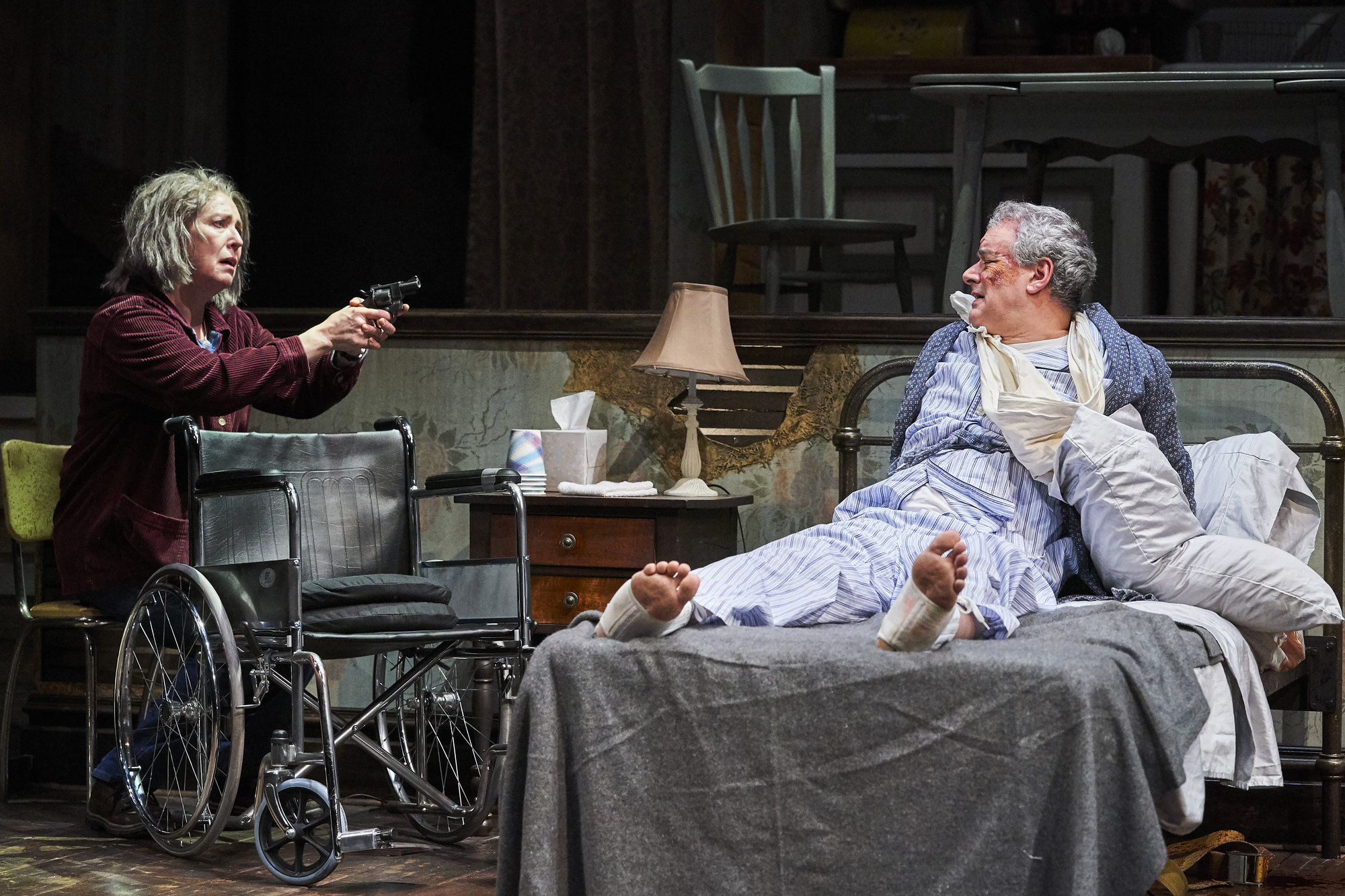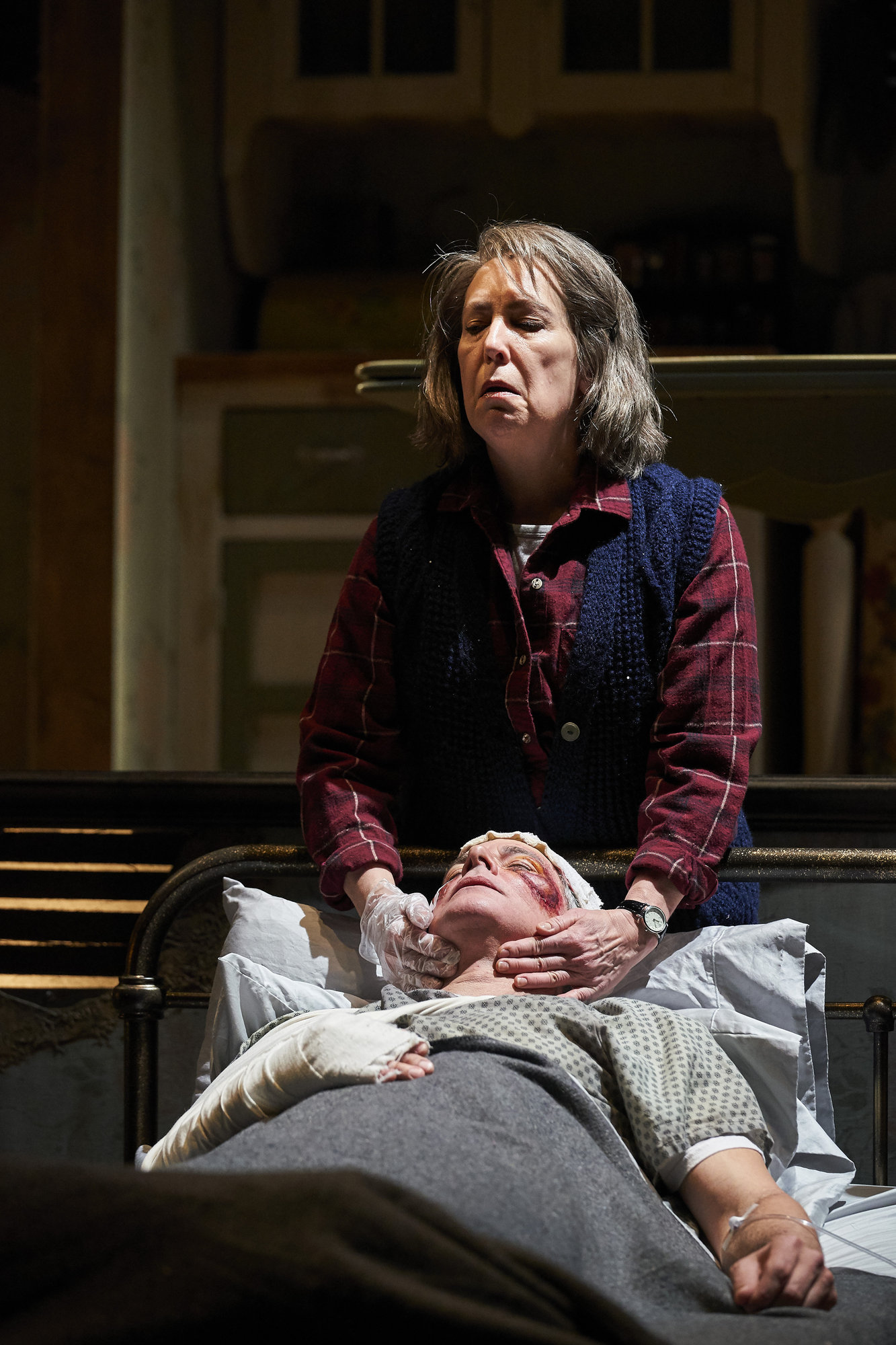 A chilling scene is set with Paul Sheldon (actor, Andrew May*) and Annie Wilkes (actor, Kathleen Pirkl Tague*) in the Great Lakes Theater production of MISERY at the Hanna Theatre, Playhouse Square which runs through March 11. (Photo by Roger Mastroianni)