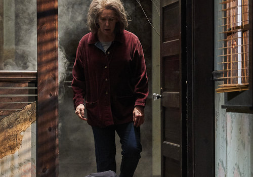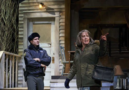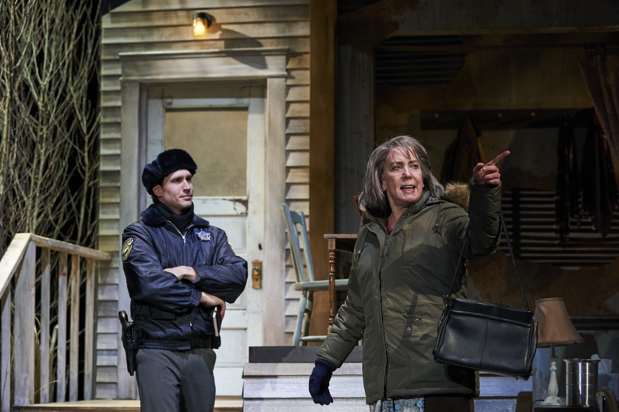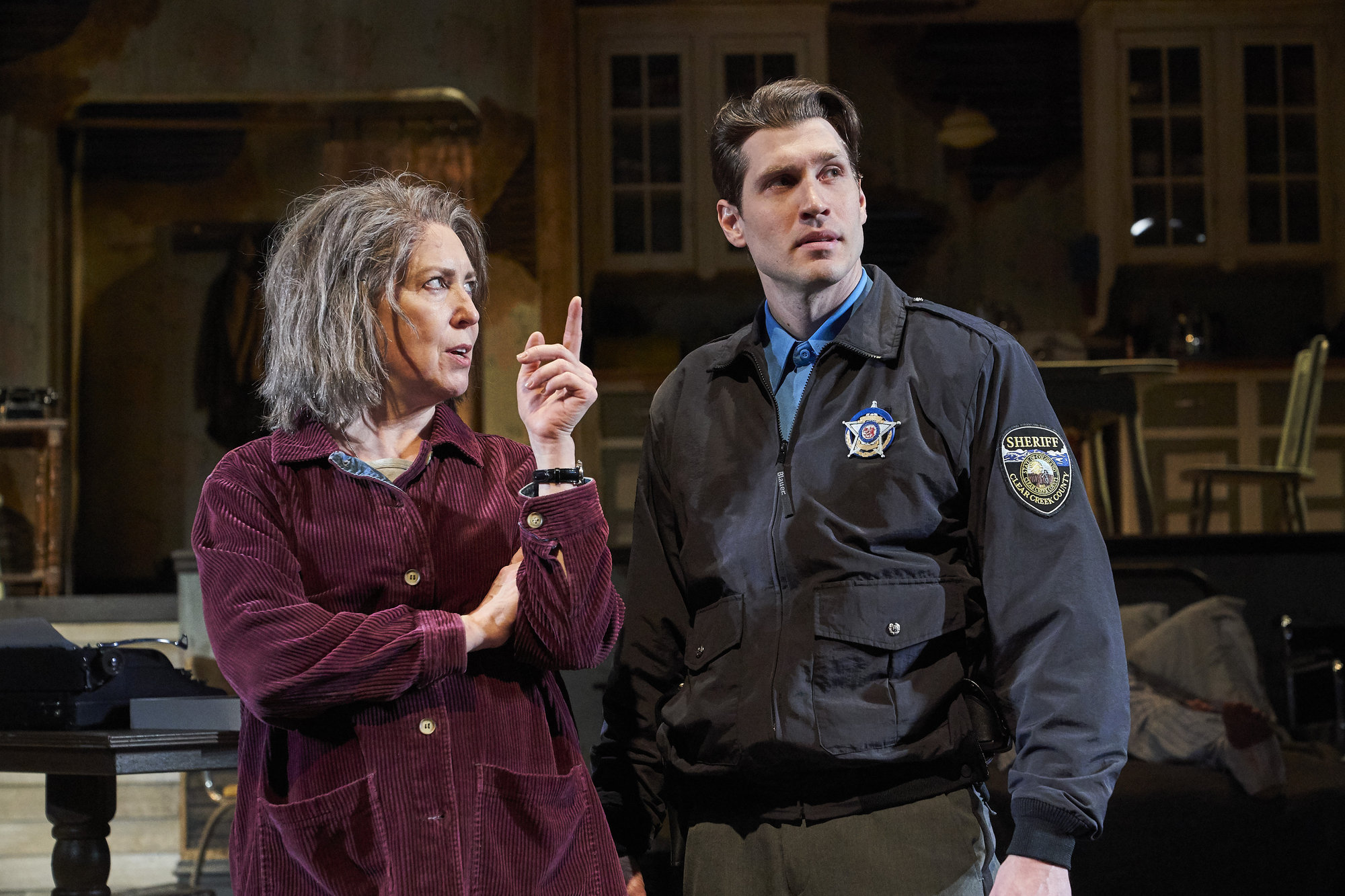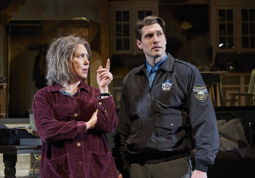Annie (actor, Kathleen Pirkl Tague*) is angered by the visit from the sheriff in the Great Lakes Theater production of MISERY at the Hanna Theatre, Playhouse Square which runs through March 11. (Photo by Roger Mastroianni)