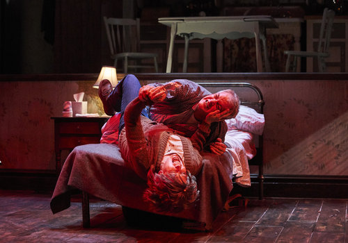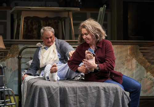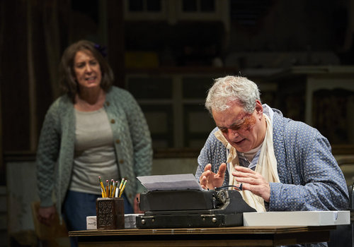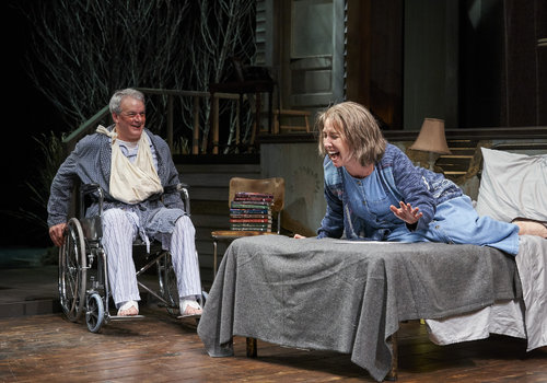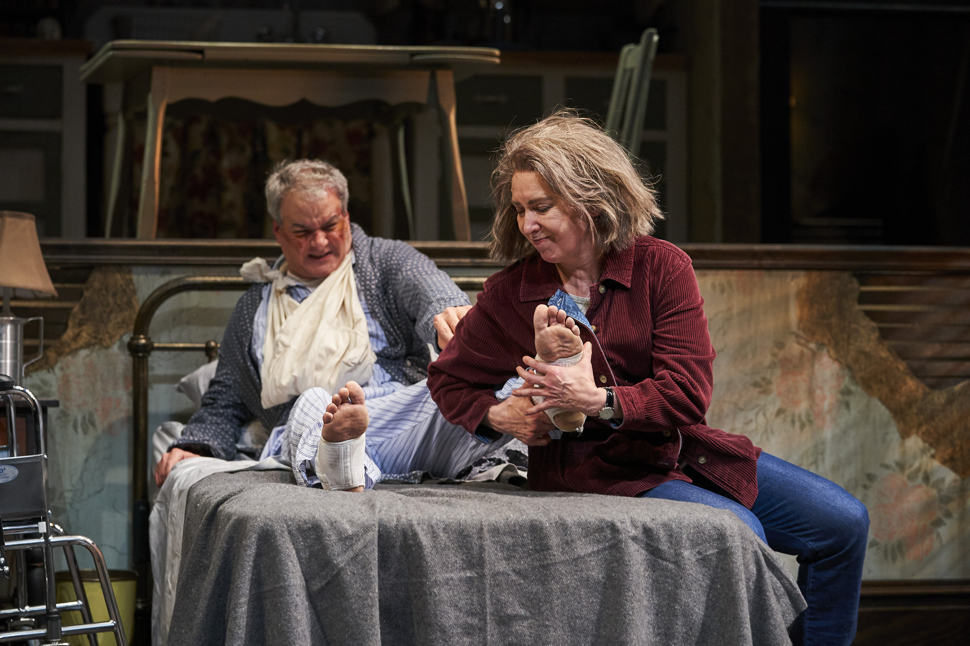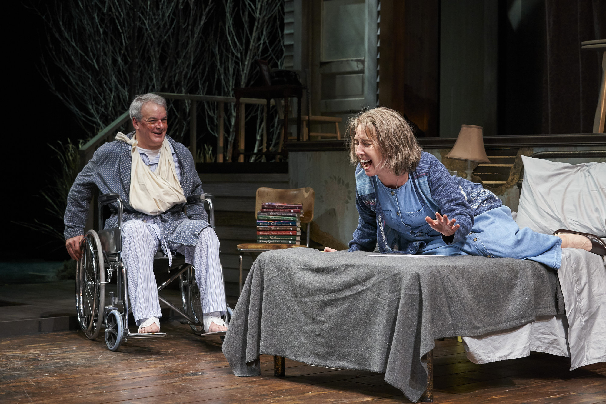Paul (actor, Andrew May*) is frustrated with the constant interruptions from Annie (actor, Kathleen Pirkl Tague*) looks on in the Great Lakes Theater production of MISERY at the Hanna Theatre, Playhouse Square which runs through March 11. (Photo by Roger Mastroianni)