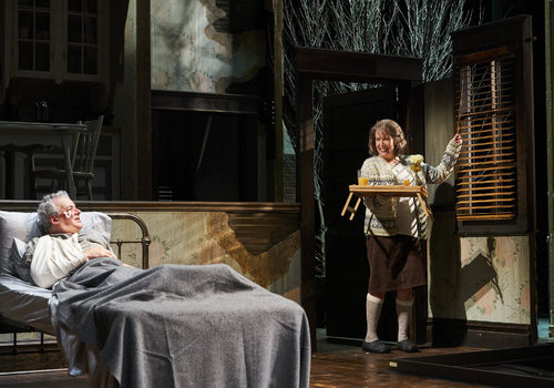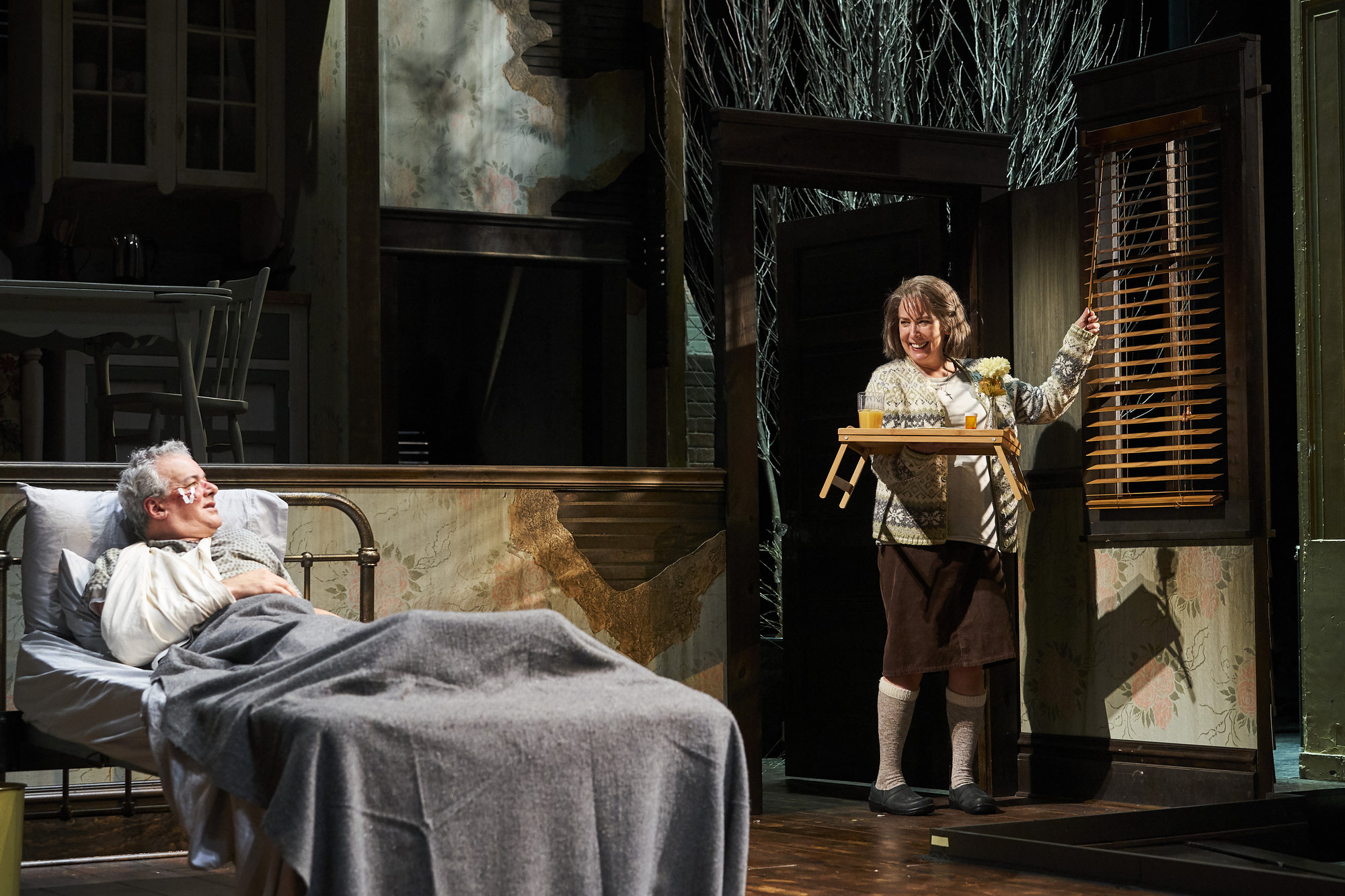 Annie (actor, Kathleen Pirkl Tague*) brings Paul (actor, Andrew May*) breakfast in the Great Lakes Theater production of MISERY at the Hanna Theatre, Playhouse Square which runs through March 11. (Photo by Roger Mastroianni)