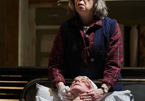 Annie (actor, Kathleen Pirkl Tague*) is focused on an unconscious Paul (actor, Andrew May*) in the Great Lakes Theater production of MISERY at the Hanna Theatre, Playhouse Square which runs through March 11. (Photo by Roger Mastroianni)