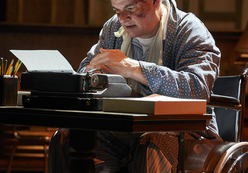 Paul (actor, Andrew May*) tries to write a new masterpiece in the Great Lakes Theater production of MISERY at the Hanna Theatre, Playhouse Square which runs through March 11. (Photo by Roger Mastroianni)
