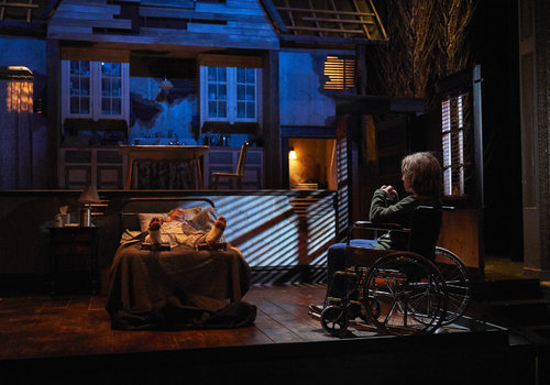Buster (actor, Nick Steen*) pays a visit to Annie (actor, Kathleen Pirkl Tague*) in the Great Lakes Theater production of MISERY at the Hanna Theatre, Playhouse Square which runs through March 11. (Photo by Roger Mastroianni)
