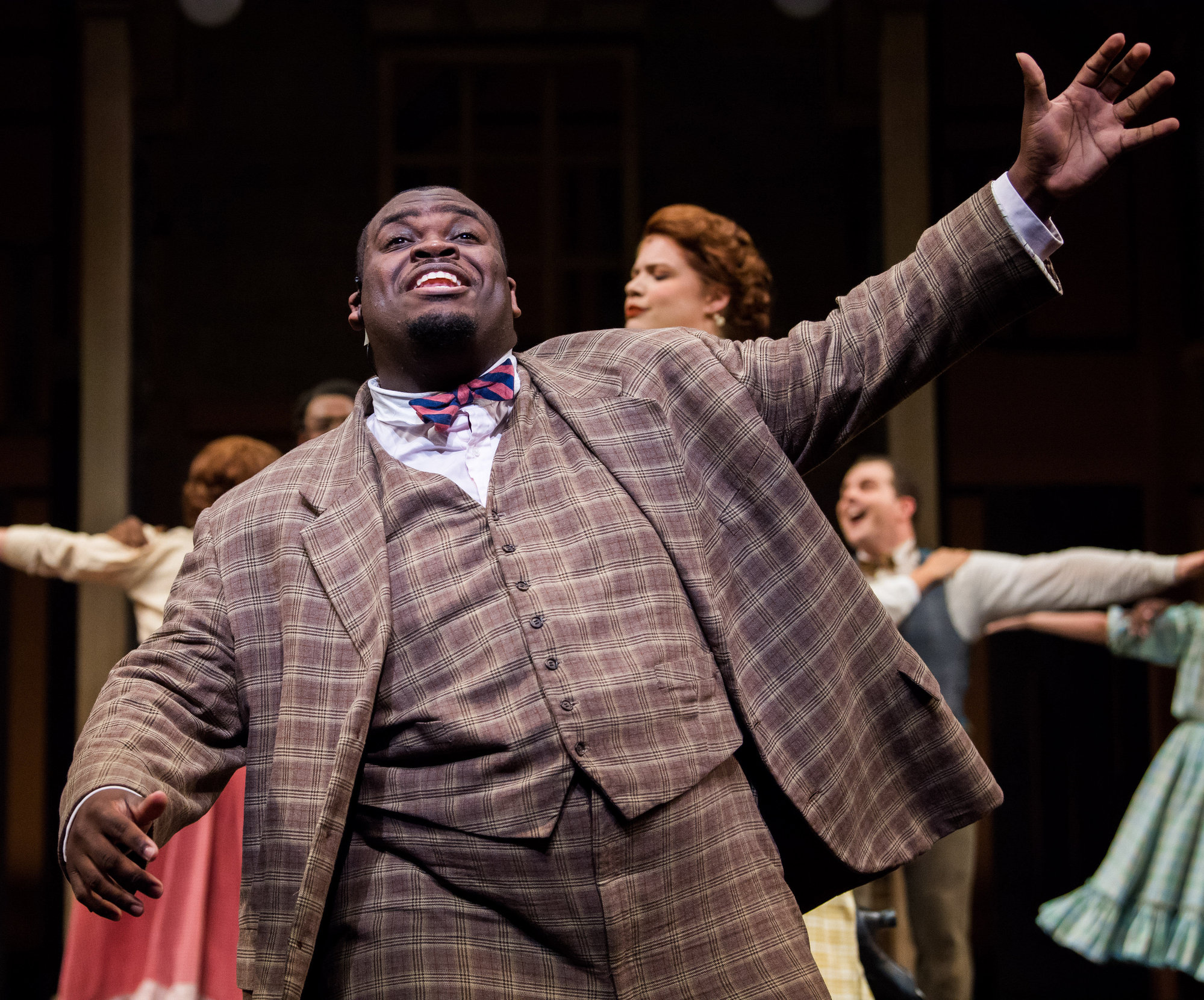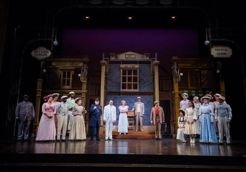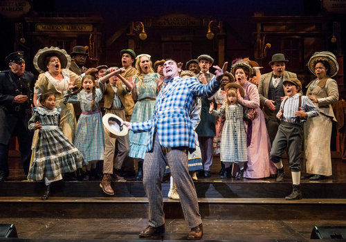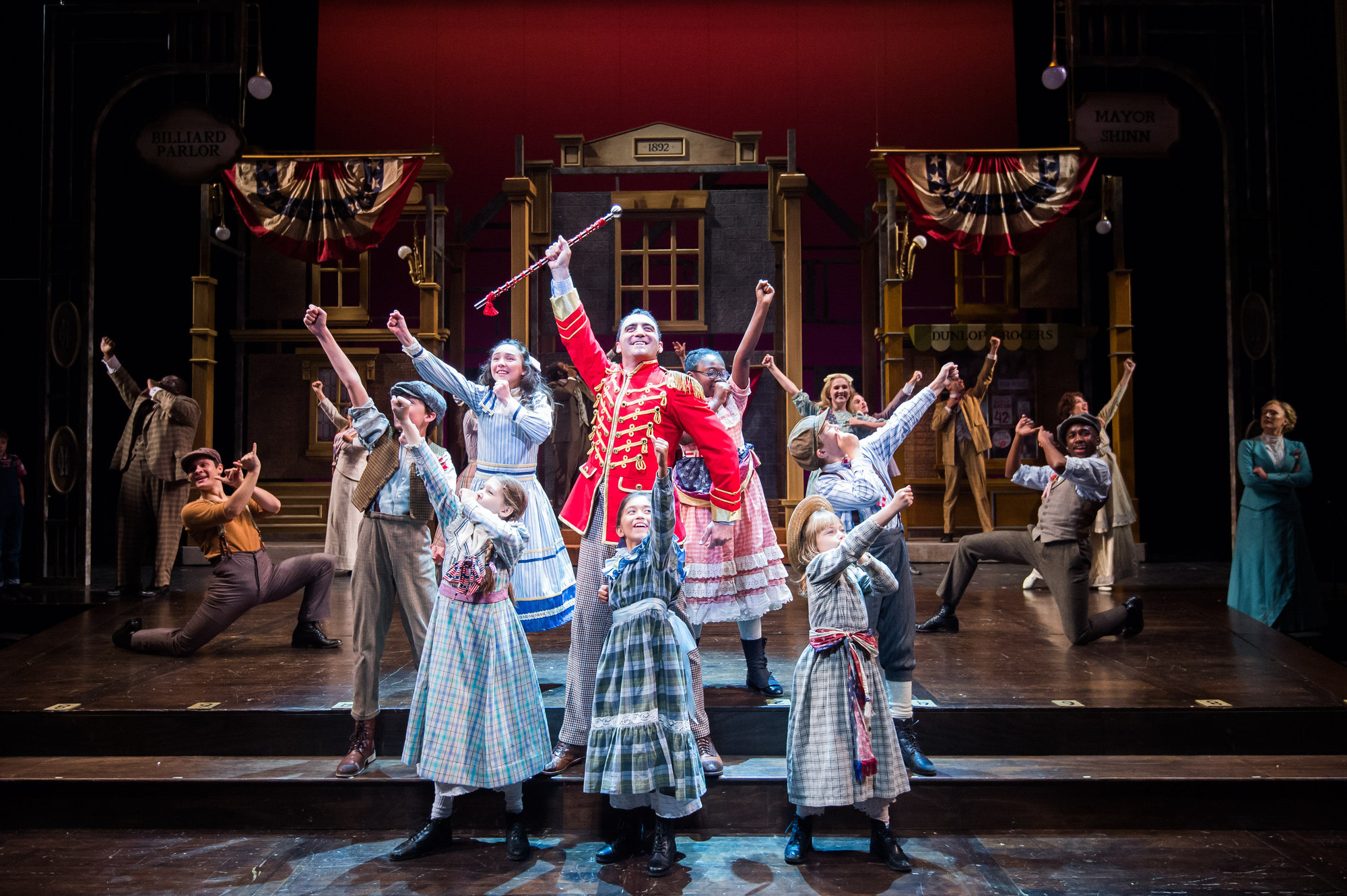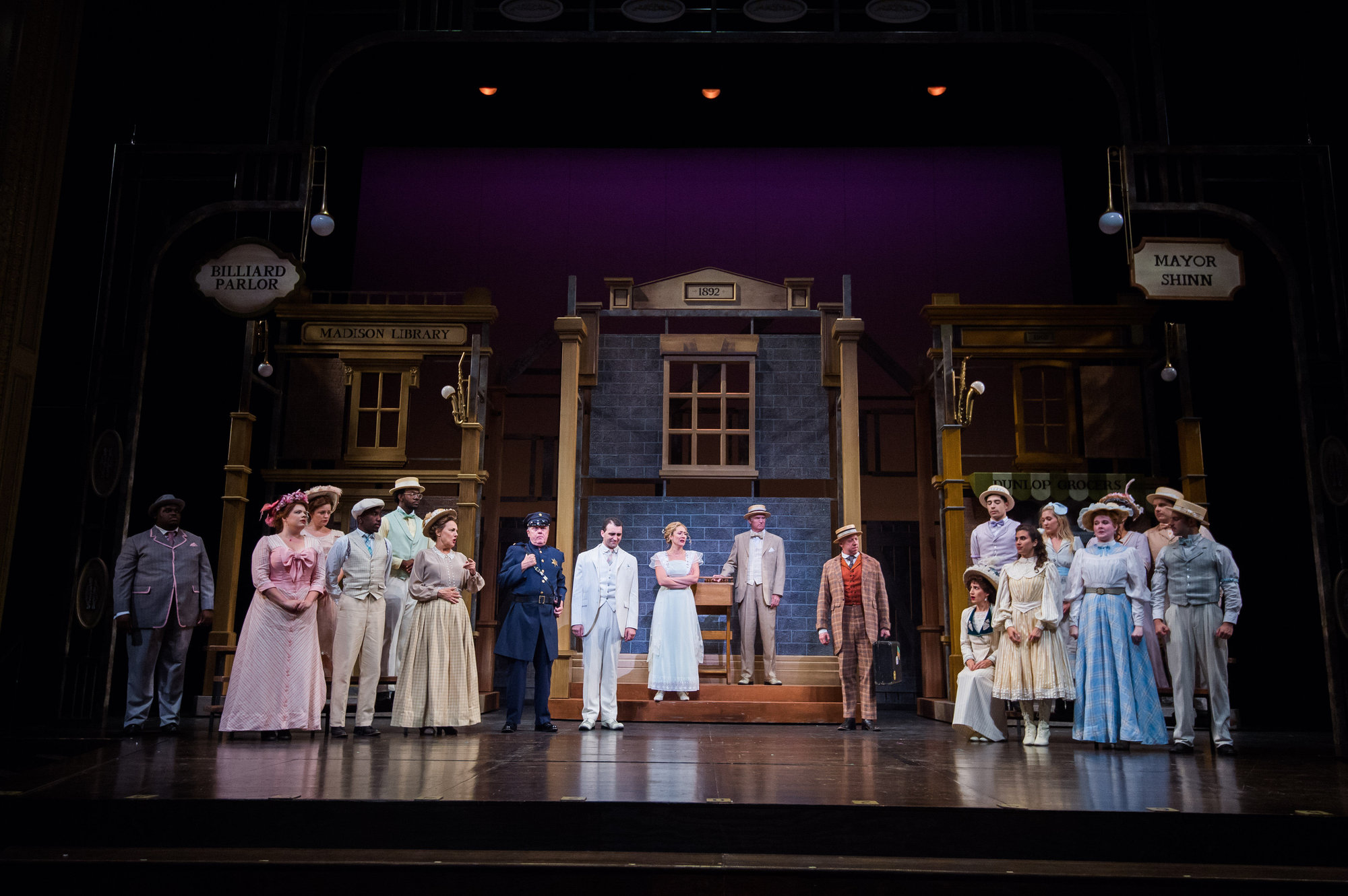 Harold (actor, Alex Syiek*) tells the citizens of River City they got “…trouble!” in the Great Lakes Theater production of THE MUSIC MAN at the Hanna Theatre, Playhouse Square which runs through November 10. Actors featured: Laura Welsh Berg*, Lynn Robert Berg*, Ally Carbonar, Aled Davies*, Elijah Dawson, Jodi Dominick*, Shelby Griswold*, Carole Healey*, Jahir Hipps, Marcus Martin*, Ian McLaughlin, Enrique Miguel, Jessie Cope Miller*, Marlowe Miller, Owen Mills, Andrew Nelin, Erin Niebuhr, Avery Pyo, Brenna Sherman, Mack Sharilla*, David Anthony Smith*, Sun-Hee Smith, Claire Soulier, August Sumlin, Boe Wank* and Chase Christopher Zadd. (Photo by Ken Blaze)